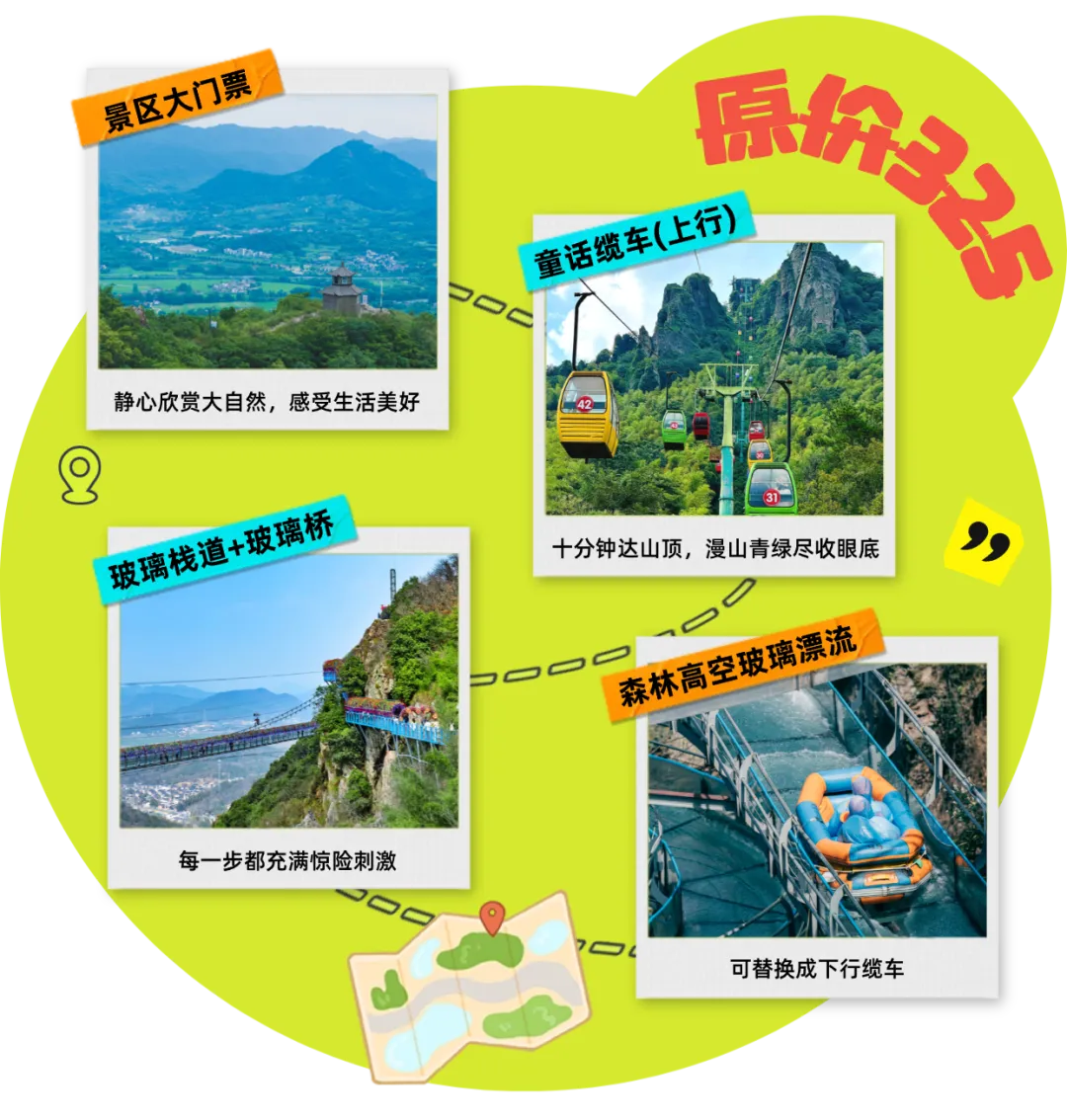 套票包含:①景区大门票;②上行缆车;③玻璃栈道+玻璃桥;④森林高空玻璃漂流(套票内玻璃漂流和下行缆车可2选1)