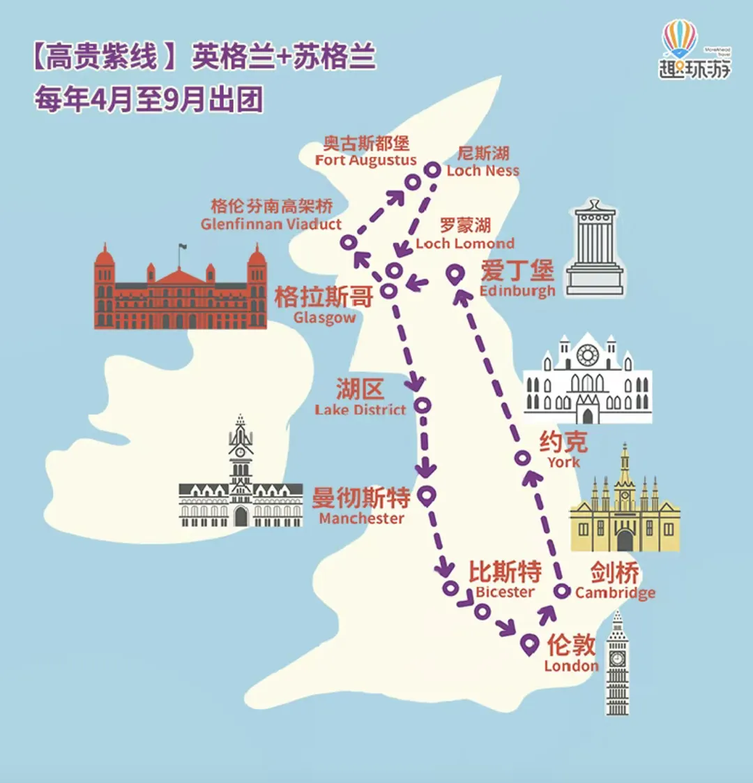 · • 英格兰 + 苏格兰环岛设计:一次旅程,纵览两地精华,城市、人文、自然层层展开,节奏从容,不走回头路。