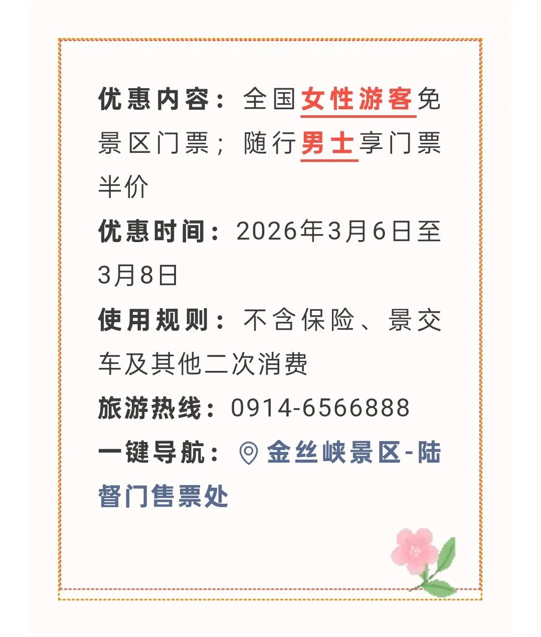 重庆:金佛山、四面山等景区在3月7日至8日(部分景区时间更长),女性可享免门票优惠。