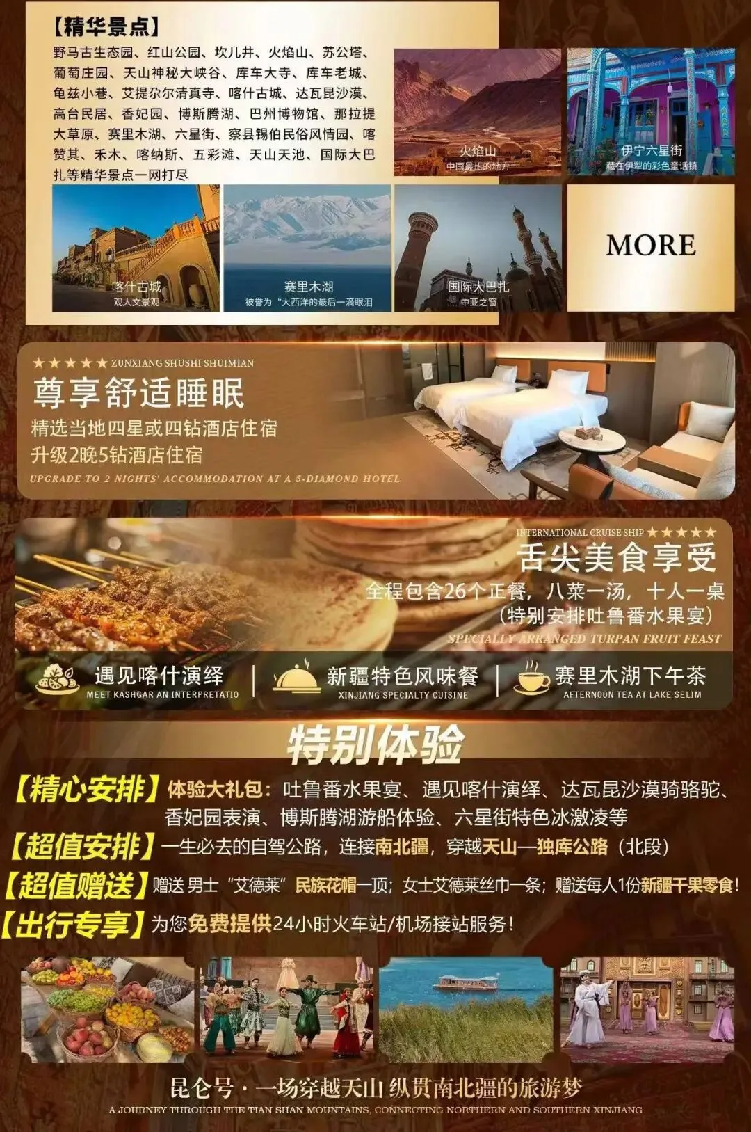 免费赠价值 1500 元体验大礼包:吐鲁番水果宴、遇见喀什演绎、达瓦昆沙漠骑骆驼、香妃园表演、博斯腾湖游船、六星街特色冰激凌、禾木云霄峰缆车、图瓦人家家访。