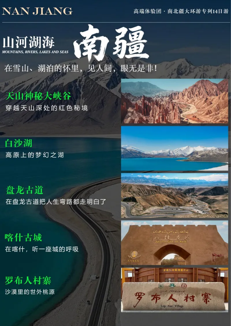 南疆秘境:喀什古城、天山神秘大峡谷、白沙湖、卡拉库勒湖、盘龙古道、达瓦昆沙漠、罗布人村寨、香妃园,感受丝路文化与高原奇景的碰撞。