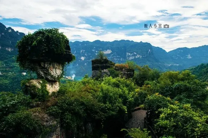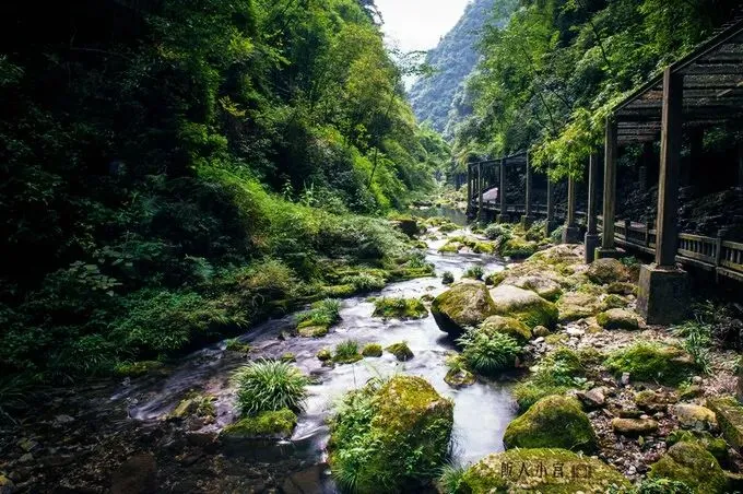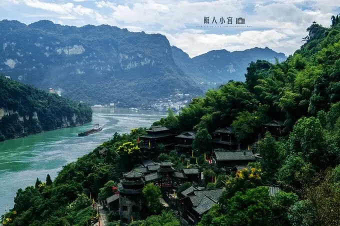 江山多娇,印象鄂西 ——三峡人家游记 三峡人家,位于湖北省宜昌市西陵峡境内,跨越秀美的灯影峡两岸,面积14平方公里,三峡人家之美,美在"湾急、石奇、谷幽、洞绝、泉甘"。 天气不错,蓝天白云,天气凉爽,江风不时扑面而来,带来新鲜的空气。船启航后,拿着相机拍了不少山水交融的画面, 坐船上的时间不长,也就半小时左右,期间你可以看到很多轮渡、货船、运砂船从你的船边经过,长江上繁忙的景象一直不停歇。 踏入长长的栈道,眼前的景致与刚才的大江大山全然不同,涓涓细流,静静流淌,青苔石块,植被丛生。 木桥下,溪边处,土家大婶洗着衣裳,晾晒树下,一幅三峡岸边有“人家”的生活场景。 几只帆船迎风而立,小渔船也撒开了渔网,还原世世代代生活在三峡的人们,靠山吃山靠水吃水的生活方式。 清风拂过,竹林摇曳,红衣姑娘,撑伞而坐……这幅场景,宛若武侠小说中才出现过的奇幻场景。 有着万里长江第一石之称的灯影石,造型奇特,下方支撑很窄,而上方巨石宛若蘑菇,看上去摇摇欲坠,然而这灯影石不知已经屹立多少个岁月了。 登上山后,俯瞰长江,苍茫的长江拐弯处,风景绝妙,听说这里被誉为三峡第一湾——明月湾,真有峰回路转、豁然开朗的感觉。(饭人小宫)