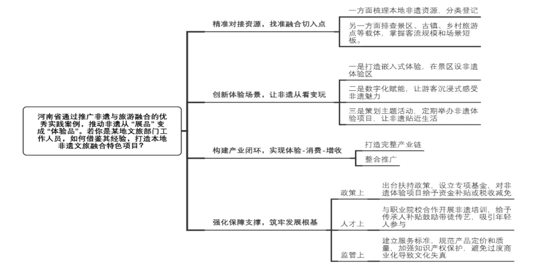 各位考官,作为文旅部门工作人员,我会借鉴河南场景化体验、产业化运作、活态化传承的核心经验,从资源对接、场景创新、产业闭环、保障支撑四个维度,打造本地非遗文旅融合特色项目,具体做法如下: