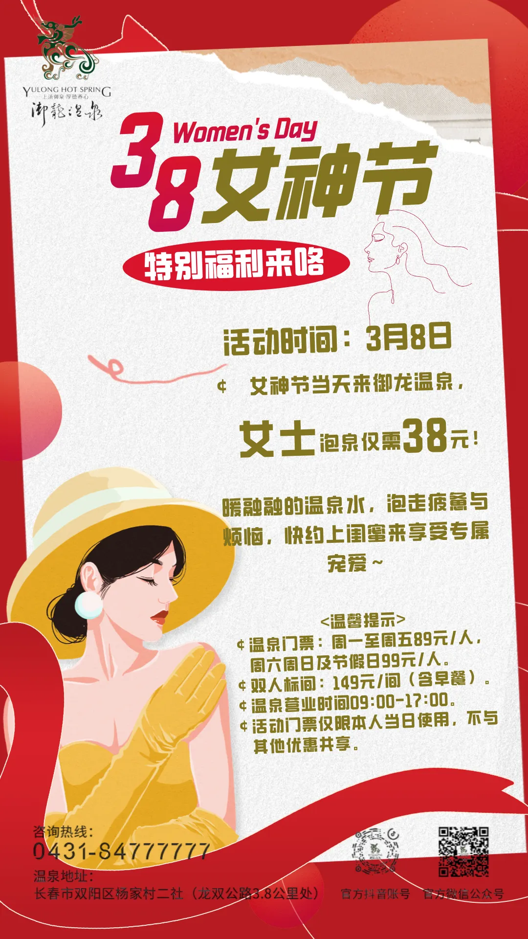 春风送暖,芳华绽放,在这个专属于女神的美好节日里,双阳文旅局邀各位女神解锁春日浪漫,邂逅鹿乡美好!以温泉润肌肤,以田园享悠然,双阳各旅游企业备上超值折扣福利,愿每一位女神都能在山水间放松自我,尽享自在时光~