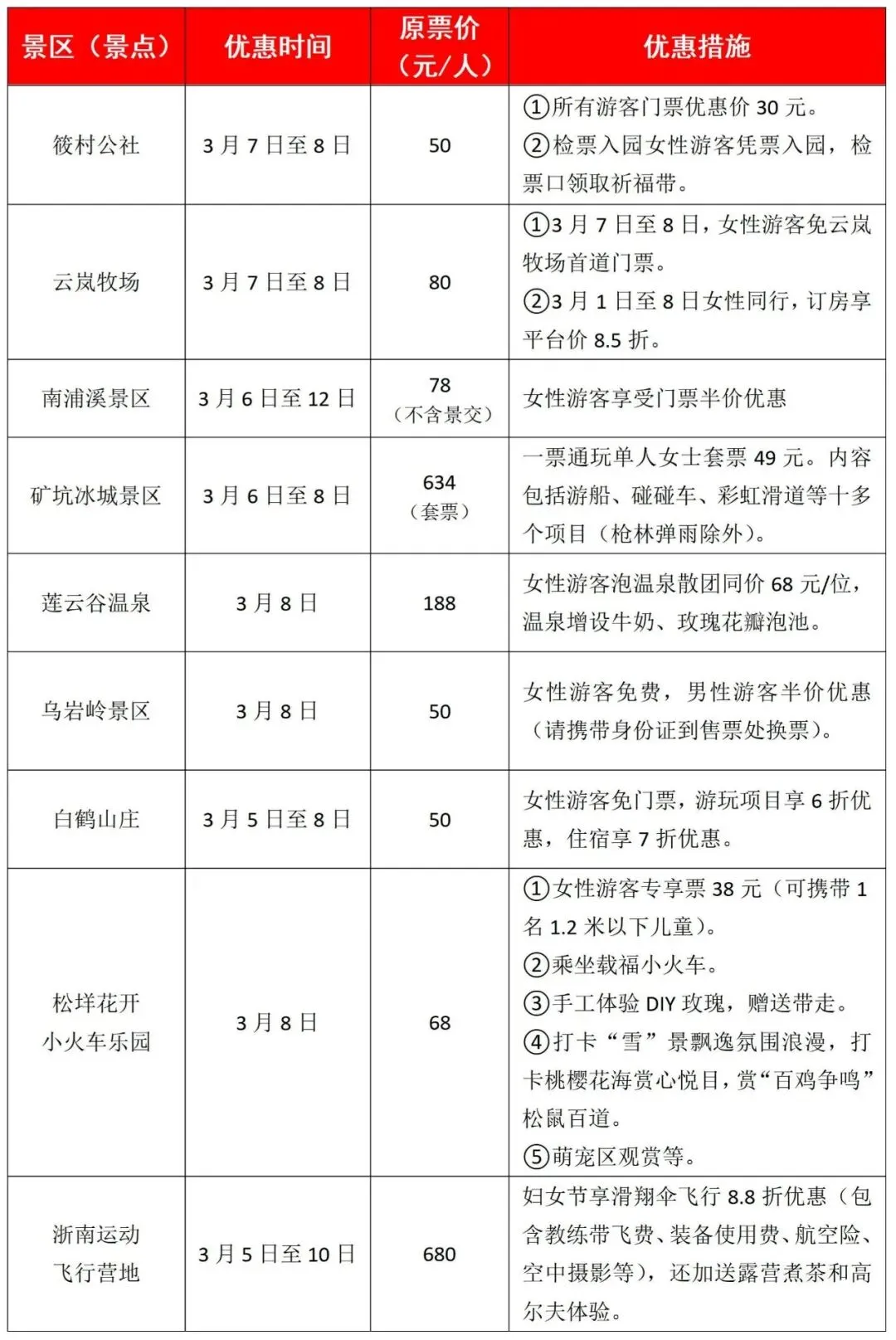 3月8日所有女性游客免费,同行男性游客享五折优惠(请携带身份证到售票处换票)