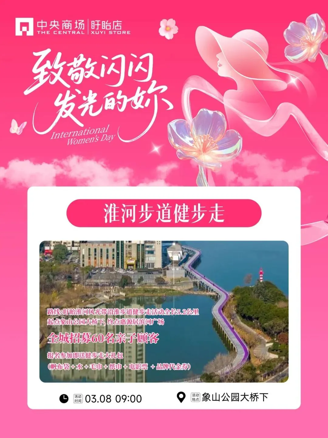 活动时间:3月8日 09:00• 集合地点:象山公园大桥下• 活动路线:盱眙淮河风光带沿淮步道,全长5.2公里,终点为惠源居滨河广场• 招募人数:60组亲子家庭• 报名福利:成功报名即送健步走大礼包(帆布袋+水+毛巾+纸巾+电影票+品牌代金券)• 💡 春日踏青,和家人一起用脚步丈量淮河之美,还能收获满满好礼!