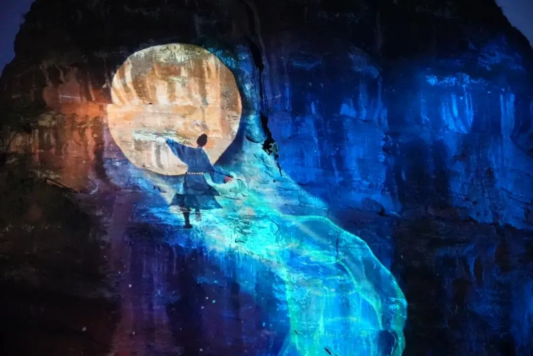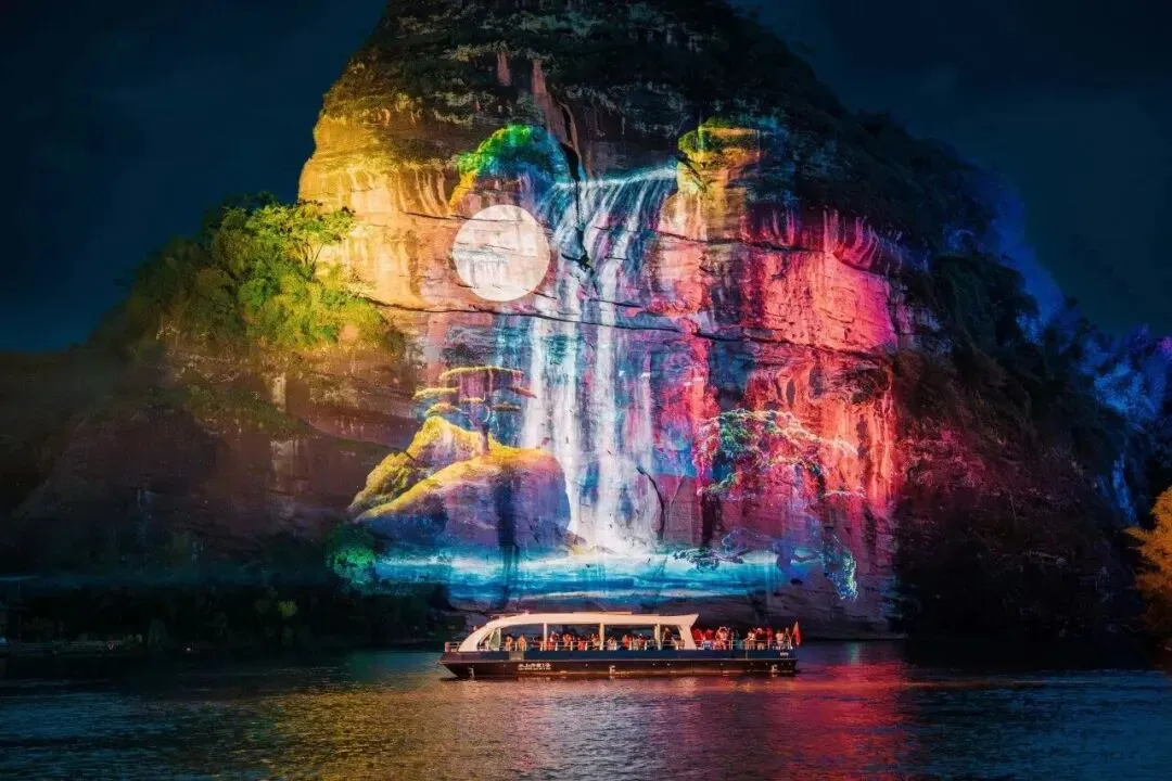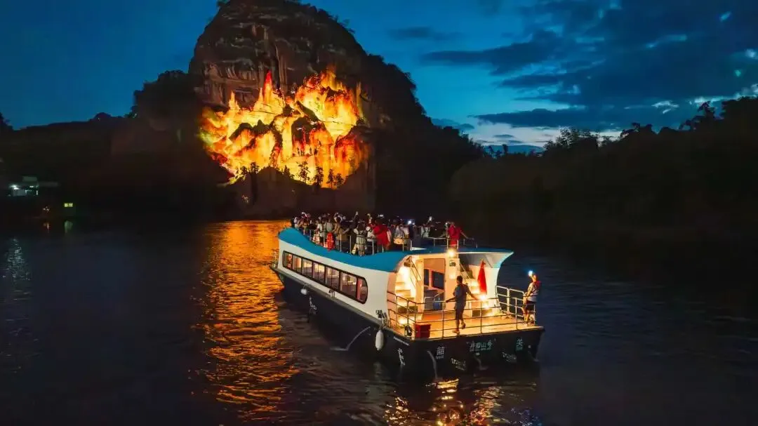 声光电在5公里山水间铺展,岭南画意、粤绣纹样在崖壁上流转,船行江心,仿佛驶入一幅流动的山水画卷。
