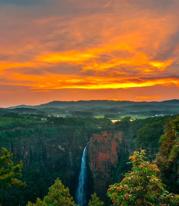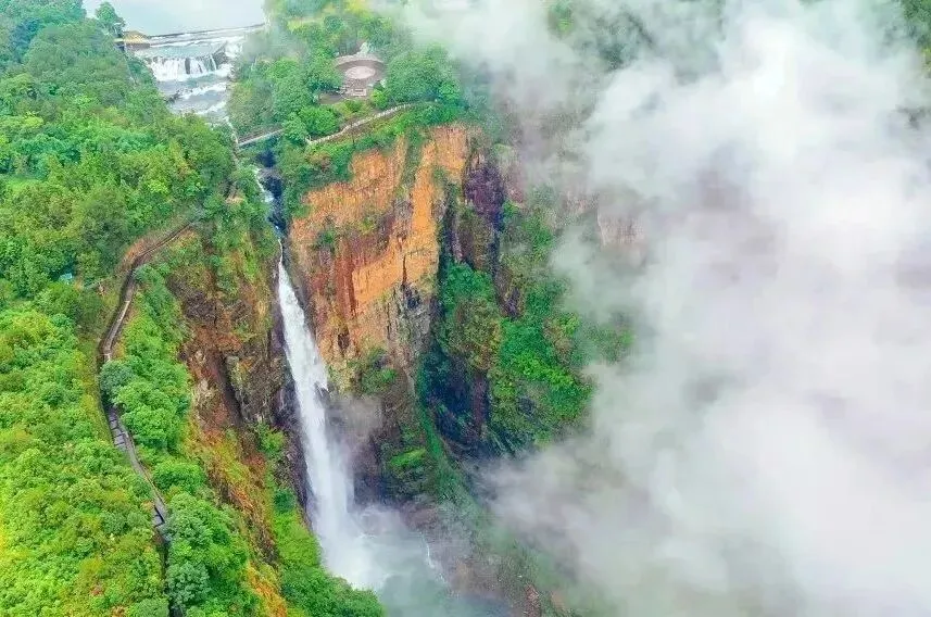 从谷口往下望,300多米深的裂谷横亘眼前,腾龙大瀑布从崖顶直泻而下,水声轰鸣。