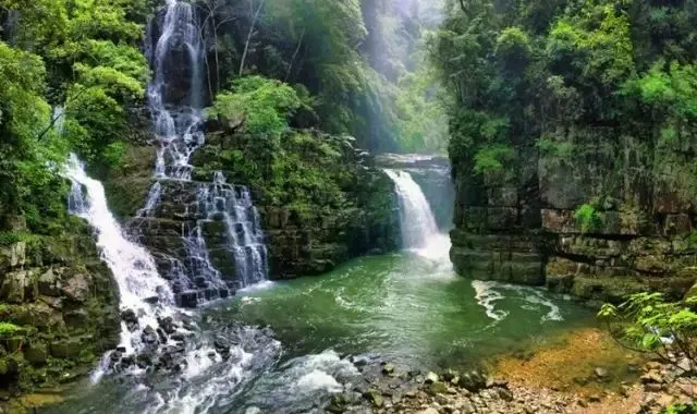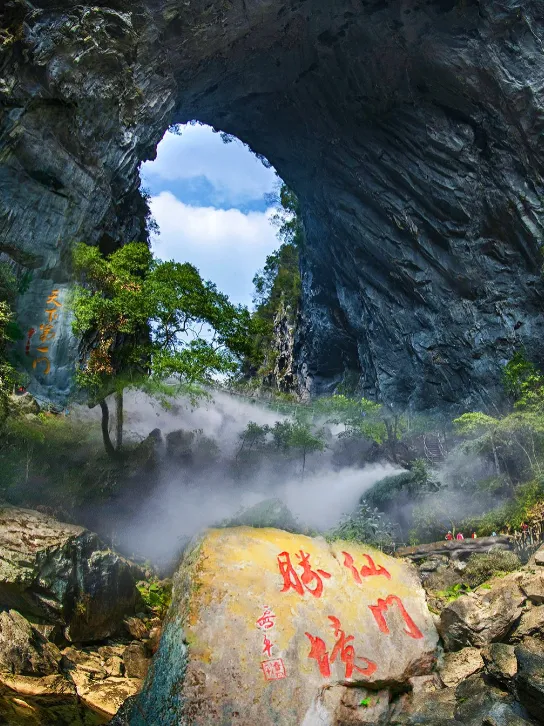 抬头仰望那138米高的天然仙门,云雾缭绕间仿佛真有仙人即将降临。拾级而上,偶遇一帘白练般的瀑布从峭壁倾泻,水雾扑面而来,在阳光下架起彩虹。