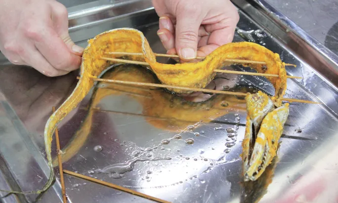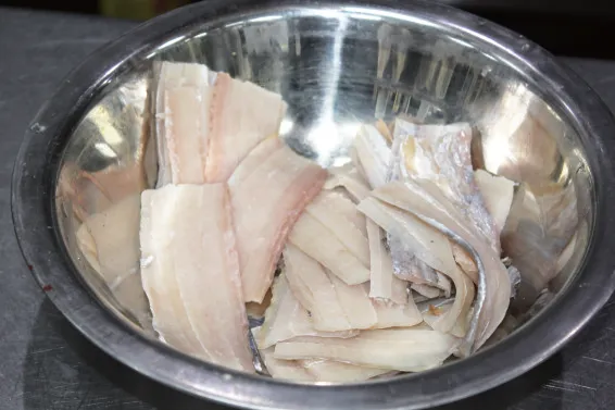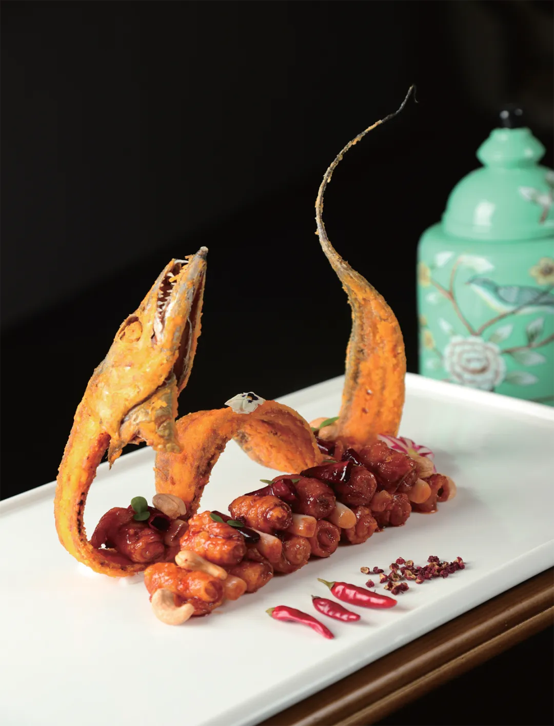 此菜造型新颖,创意独特。把净带鱼肉卷裹造型成筒,再赋予煳辣荔枝味,酥腰果不下锅裹汁,而是与炸酥的带鱼骨搭配作为装饰点缀。