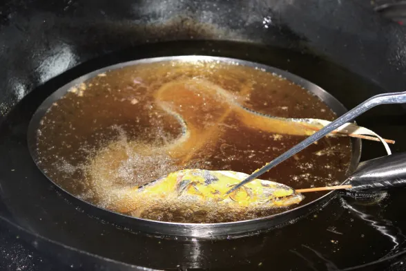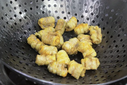 3.锅入色拉油烧至六成热,下入肉丁大火炸2分钟,定型后调小火,炸至表面色金黄且外酥里嫩,起锅沥油。