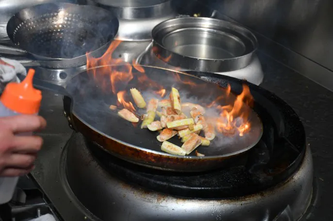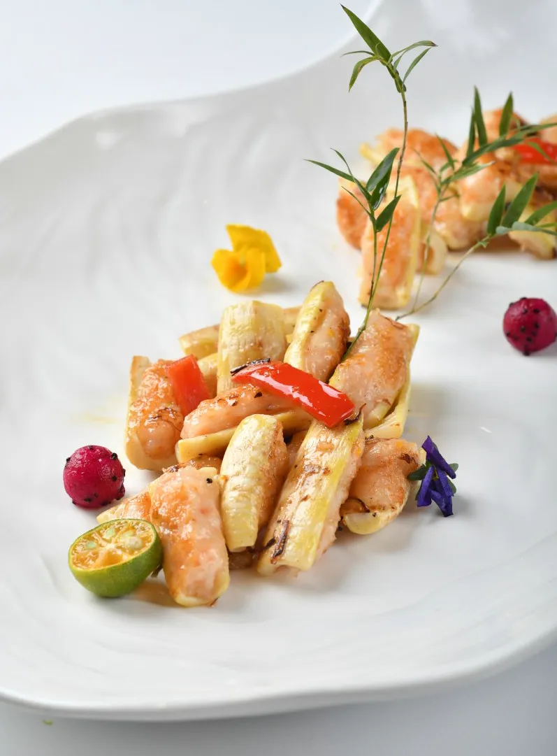 鲜嫩脆爽的笋子与鲜美有弹性的虾肉搭配成菜,做法是,虾胶酿入笋中,用平底锅煎熟,成菜咸鲜干香。