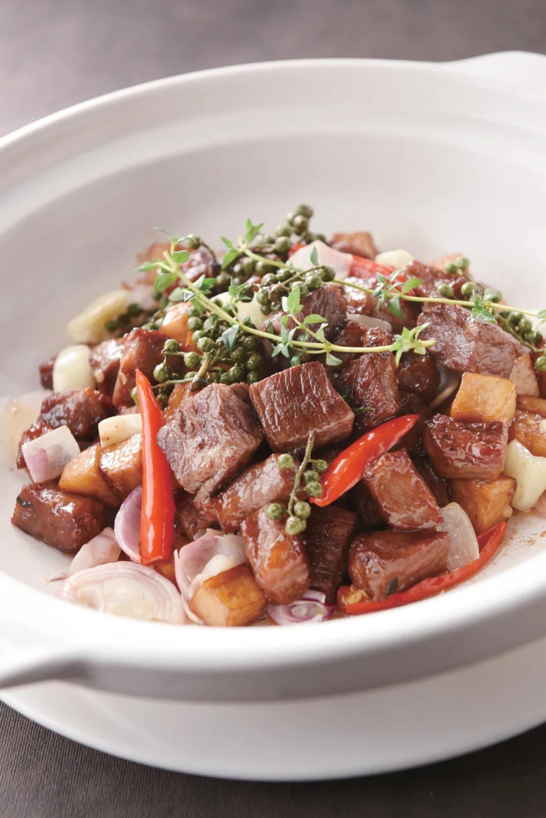 2.砂锅上火,放入适量黄油融化,焗香大蒜、姜粒、干葱块,下牛肉粒和炸好的杏鲍菇块,均匀的浇上调好的味汁。放入鲜青花椒、美人椒块、百里香、盖上砂锅盖焗30秒起锅上桌,喷适量白兰地点火,待火苗熄灭即可食用。