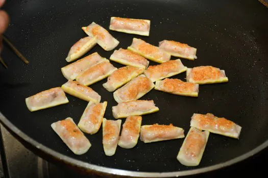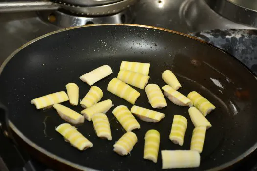 3.平底锅上火,放入色拉油炙好锅,留底油,下入酿好虾胶的熊猫笋小火煎。其间视情况加入少许油,并不停转动平底锅,待两面煎至金黄且熟后倒出来,备用(见图2、图3)。