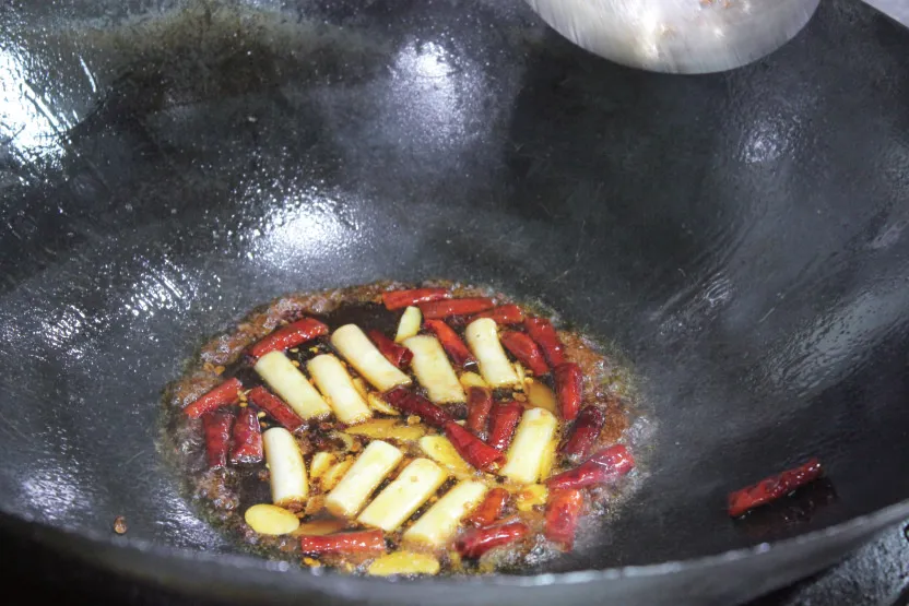 3.锅入猪油烧热,下姜片、拍蒜、五花肉片煸香,依次放入樟树椒、鲍片、青椒酱、盐、味精翻炒熟,起锅装盘即可。