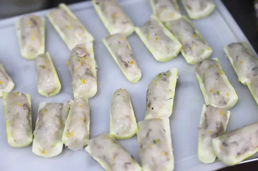 2.将虾仁打成虾胶,纳盆加入少许陈皮末、香菜末、盐、蛋清、鸡精、味精搅匀。然后取适量虾胶逐一酿入笋段,备用(见图1)。