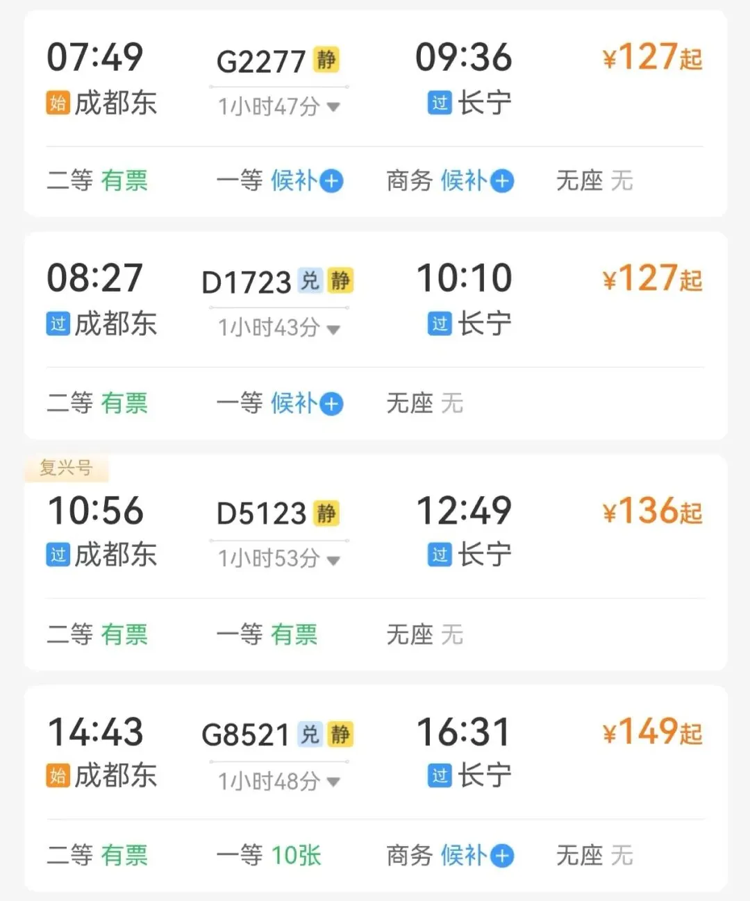 成都东站—长宁站日均开行列车5趟