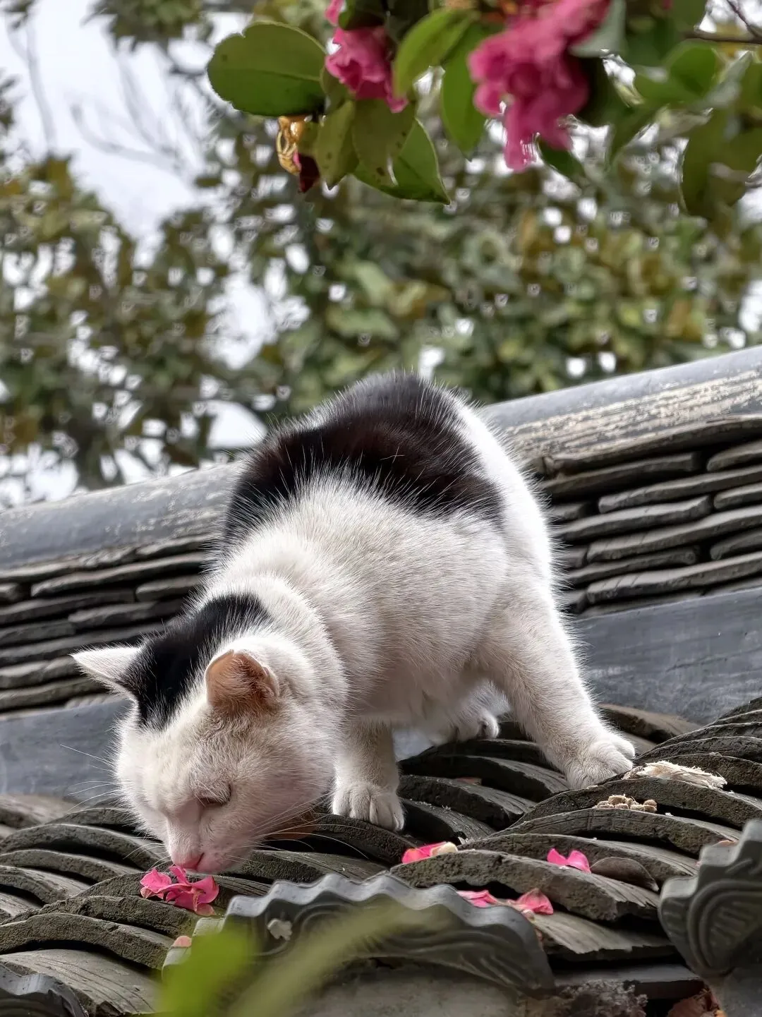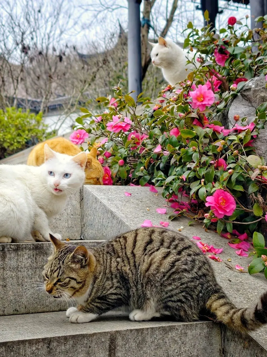 常州园:杏花疏影里,茶梅倚石阶。看狸猫追影,白猫凝望落花成诗。