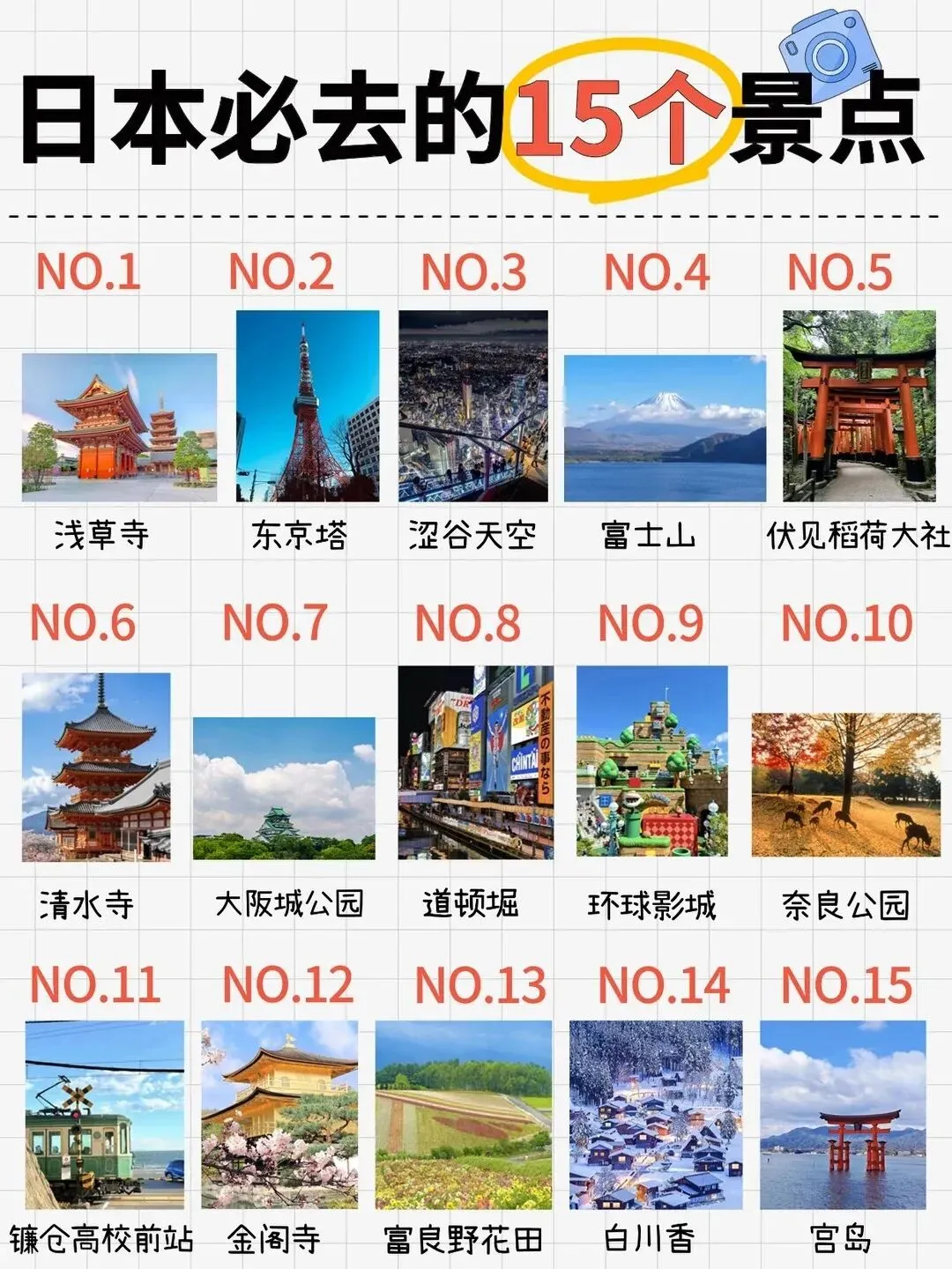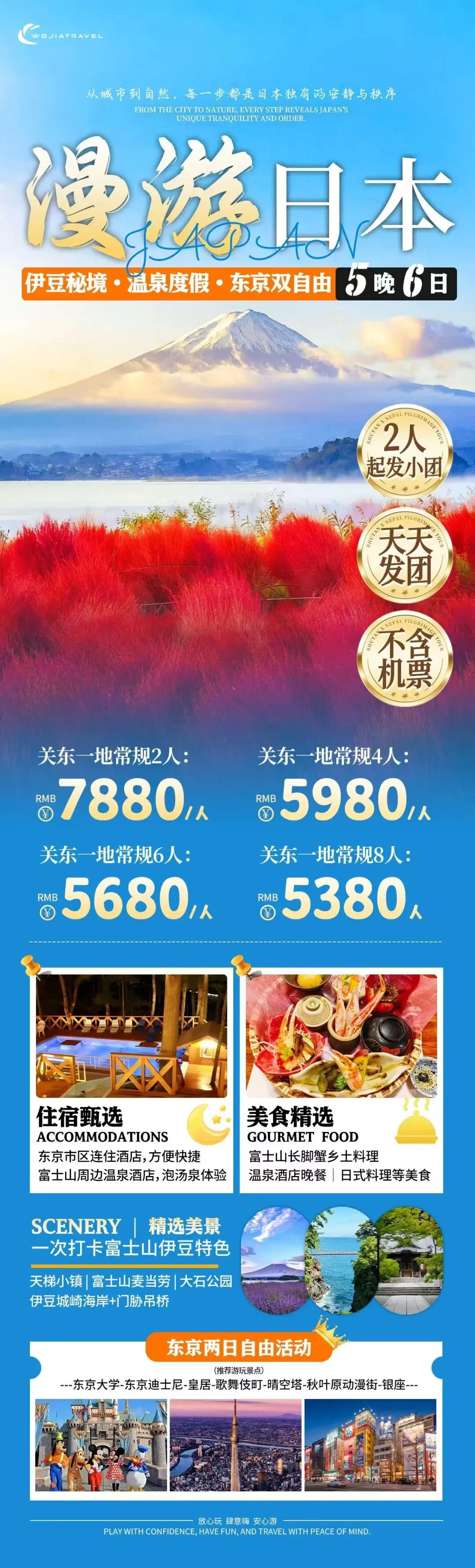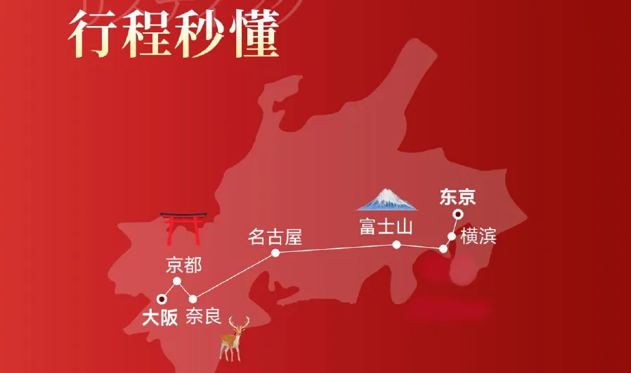 ![]() ![]() ![]() ![]() ![]() ![]() D1 :北京首都机场→东京羽田机场NH962 1510 1935 请游客本人自行前往北京首都机场,办理登机手续。抵达机场后,导游迎接各位贵宾后乘坐专车前往酒店。安排入住后,休息或周边自由观光。 参考住宿:成田马洛德成田汤乐城京成米拉玛丽安比(东京)酒店或同级 用餐:自理,交通:飞机、巴士 D2:东京 早餐后,乘车前往日本首都——繁华都市东京。 【浅草寺】(约30 分钟)浅草寺曾是日本江户时代最繁华的商业娱乐中心、也是东京最古老的传统文化街区、至今仍是观光客人必访之地。从雷门通往本殿“参道两侧”的“仲见世”商业街鳞次栉比的商铺里您可以购买到各种富有日本传统色彩的工艺纪念品。 【秋叶原动漫街】(约60分钟)作为世界上屈指可数的电器街,如今的秋叶原正发生着日新月异的变化。除了电器商品专卖店之外,商务、饮食等服务功能也日渐具备齐全,正在发展成为一个具有综合性色彩的繁华区域 【银座】(约90分钟)位于东京中央区,这里著名百货公司林立,人流和车流川流不息,彻夜灯火通明,充满繁华的都市气息. 【台场海滨公园】(约40分钟) 台场海滨公园是位于日本东京湾畔的一座人工海滨公园,这片土地是通过填海造陆形成的。这里可以欣赏东京天际线和彩虹大桥的美景。公园的一端还矗立着一尊自由女神像的复制品,它是为纪念日法友好而于2000年永久设立的,约为纽约自由女神像的七分之一大小,是人气合影点。 参考住宿:成田马洛德/成田国际花园酒店/成田汤乐城或同级 参考用餐:早午晚,交通: 巴士