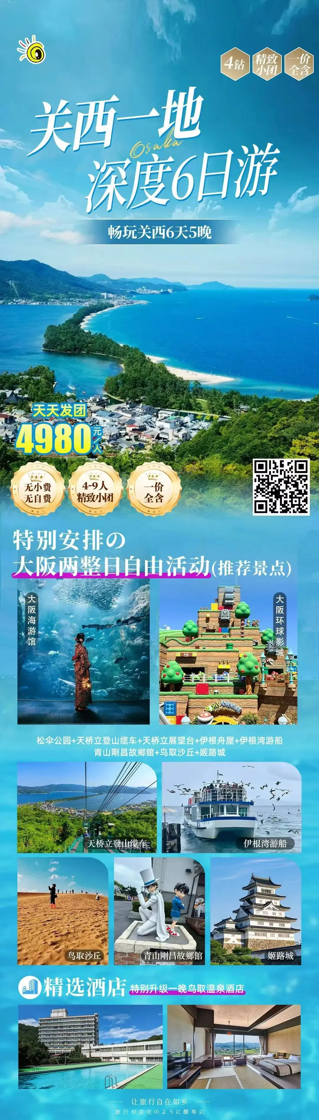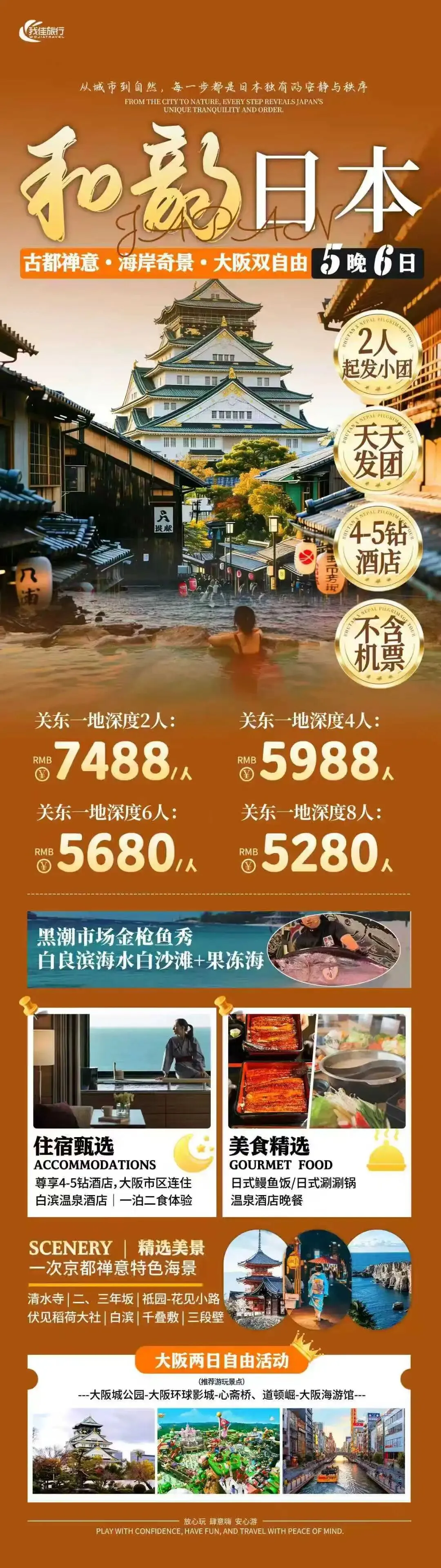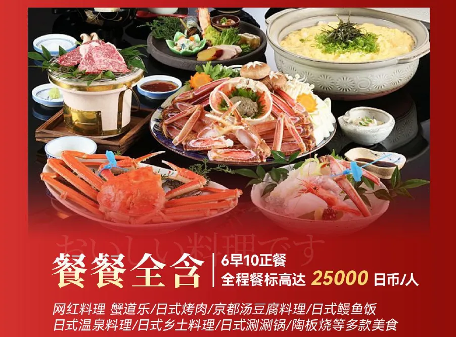 D7:大阪关西机场-北京首都机场NH979 0930 1205 酒店早餐后,乘车前往大阪关西机场搭乘航班返回北京。 住宿:温馨的家参考,用餐:早,交通: 巴士、飞机 包含项目: 1. 北京/ 日本往返国际机票团队经济舱费用,含机场建设税; 2. 行程所示酒店标准双人间,温泉酒店二人间; 3. 境外旅游巴士费用及司机服务(根据实际收客人数,适当调整车型); 4. 行程内所列用餐; 5. 行程中所列景点门票; 不含项目: 1. 护照费用; 2. 洗衣,理发, 电话,传真,饮料,烟酒,洗熨、付费电视,行李搬运等境外个人消费费用; 3. 旅游者因违约、自身过错、自由活动期间内行为或自身疾病引起的人身和财产损失; 4. 服务包含项目未提到的其它一切费用。 |