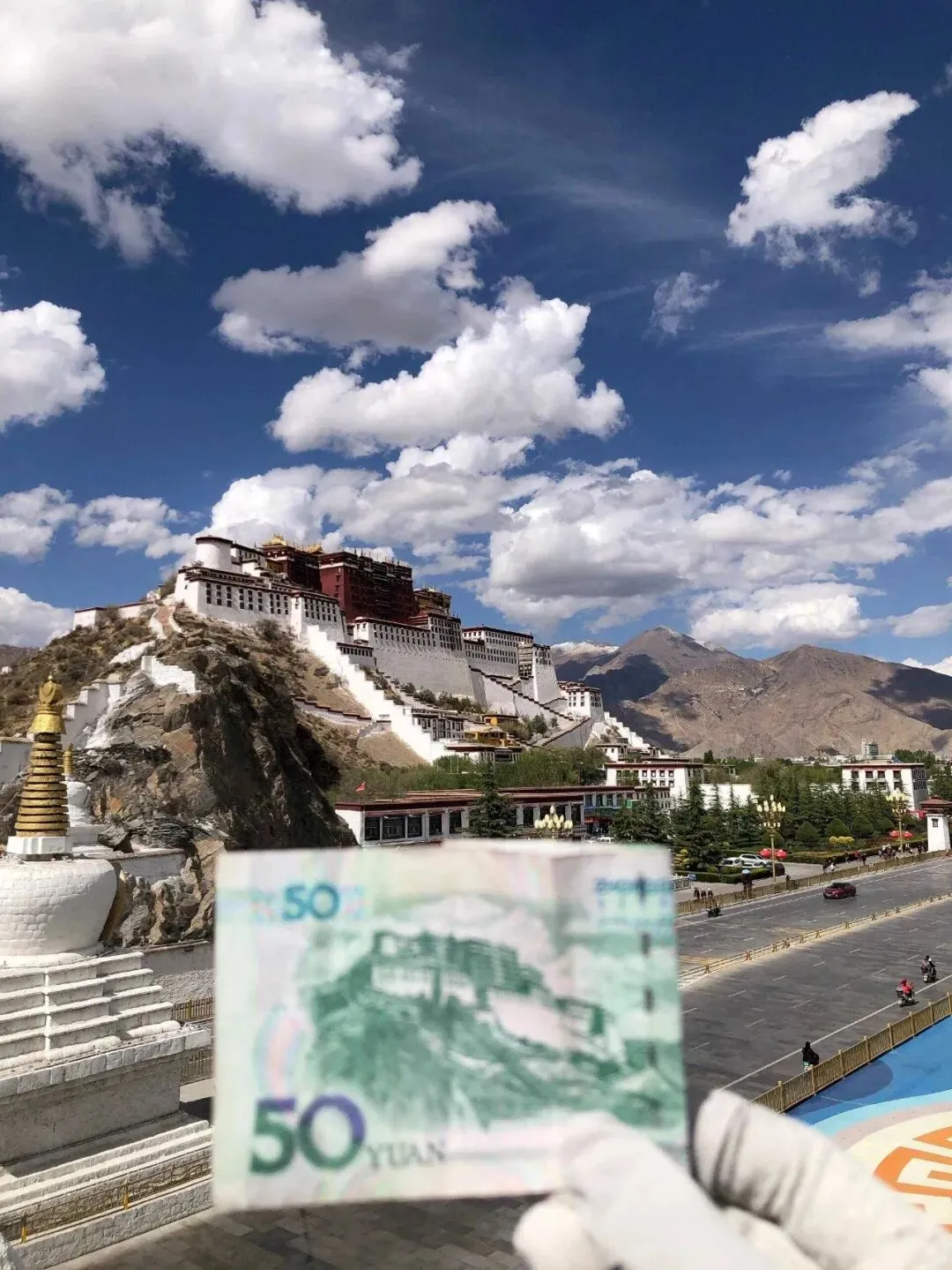 药王山.观景台那儿,常.年蹲着一排.人,手里攥着.五十块纸币,对.着.角度拍。.我也跟着比.划了.半天,纸币.上的图.案跟真景对上那.一刻.,还挺有意思.的。布达拉.宫的白.墙叫“.牛奶.墙”,每年秋天藏.族.同胞会.用牛奶、蜂蜜、藏红花混着石灰.重新粉刷一次,走.近了能闻.见淡淡的甜味儿。