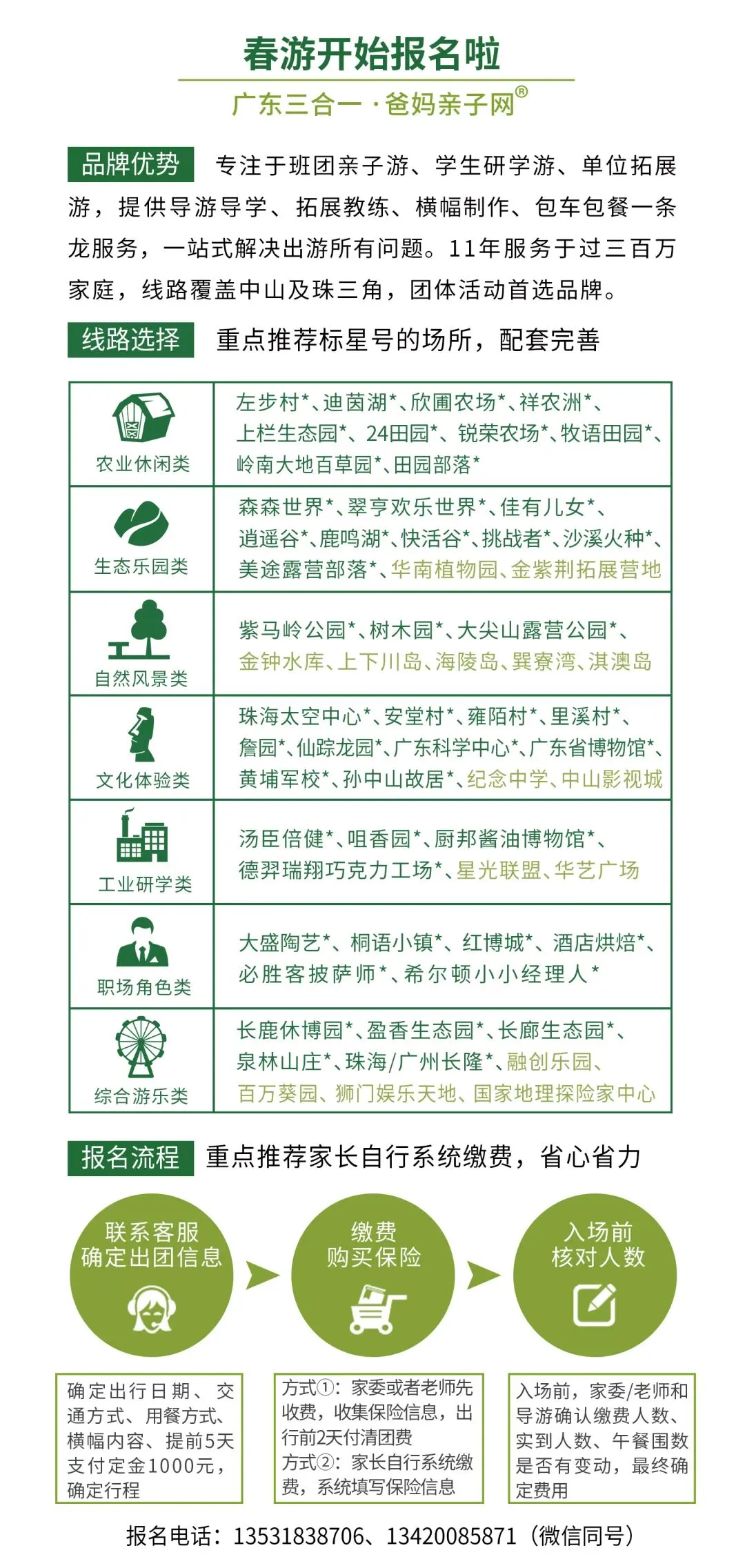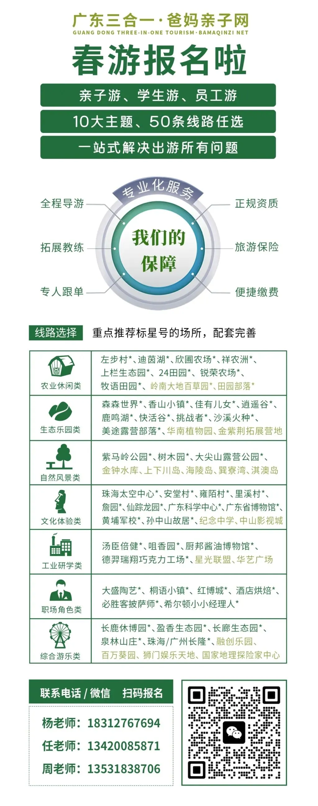 广东三合一/爸妈亲子网专注于由内容的团体活动策划,为团体游客提供横幅、保险、导游、一条龙服务,一站式解决出游所有问题。
