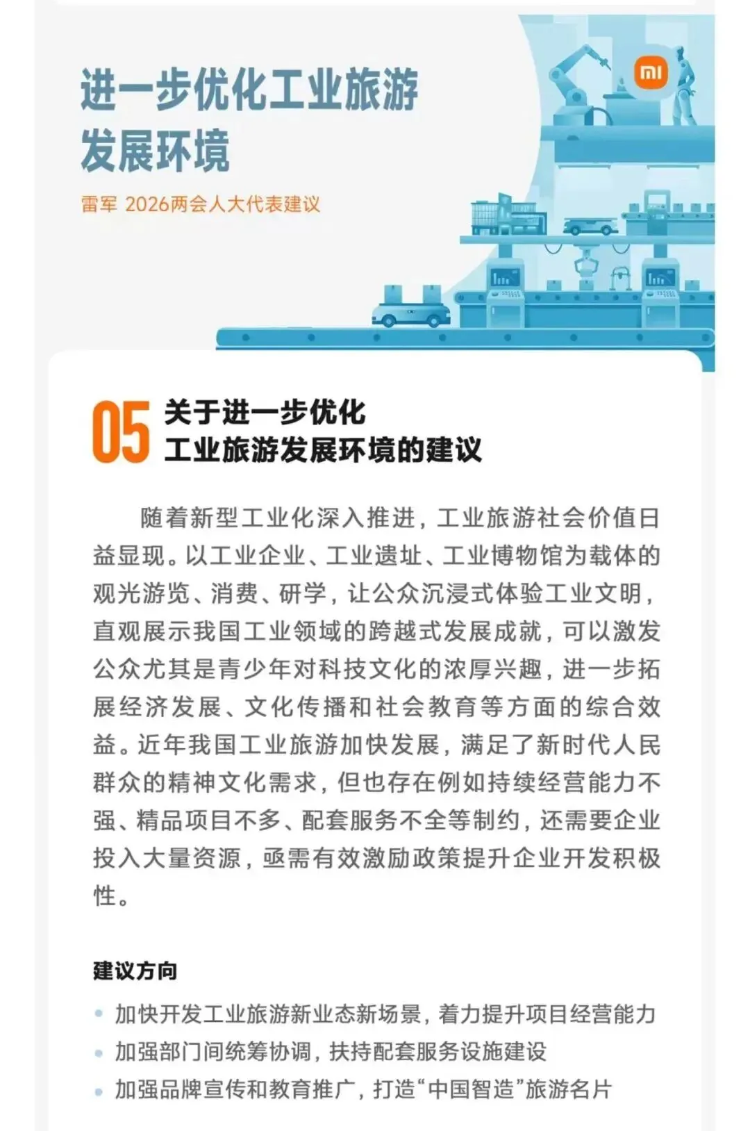 2026年全国两会期间,全国人大代表、小米集团创始人雷军提交建议,围绕进一步优化工业旅游发展环境提出三项具体举措,助力工业文明传播与青少年科普教育。