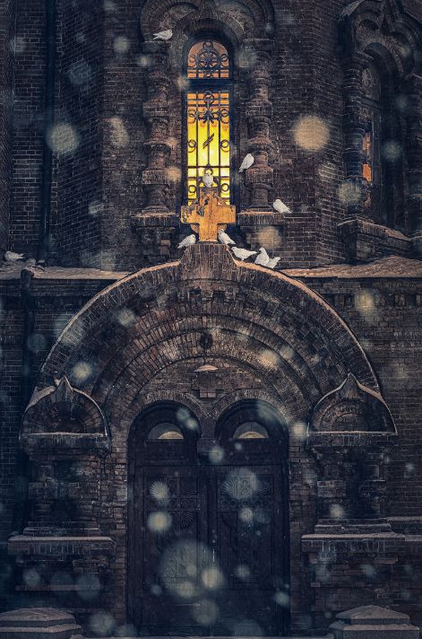 在雪花纷飞的时候看鸽子落在圣索菲亚大教堂前