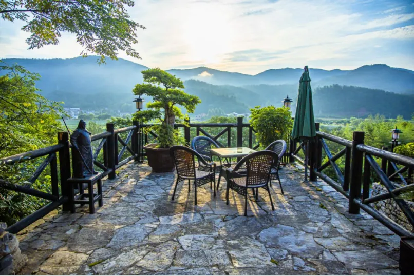 景区内的古寨客栈,是度假出行的绝佳落脚点。客栈外部以南漳传统民居风格打造,与古寨原生风貌浑然一体,内部则配齐了现代化设施,共设十三间客房。客栈半隐于山间,推窗即是满目青绿,宛若置身绿野仙踪;站在客栈露台极目远眺,远山含黛、田园叠翠,一幅山清水秀的诗意田园画卷尽收眼底。四季更迭间,山林景致各有韵味,游客以最贴近的姿态拥抱这片山林的自然之美。同时配套古色古香的会议室,可承接各类团建、小型商务会议客栈,客栈的美食充满了山间野趣,茅坪河的河鲜,时令山珍野菜,高山田园绿色无污染的果蔬,山野黑猪肉炮制得颜色如红玉髓一般的腊肉香肠……每一口都是绿色健康的人间美味。除了舒适的度假住宿,景区还深度挖掘荆楚在地文化,打造了丰富的非遗民俗体验。在这里,你可以参与财神版画,瓦片画拓印等非遗手作,亲手触摸传统技艺的魅力,带走专属的古寨文创纪念品。