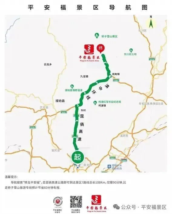 平安福景区距离昆明市区108公里,走昆倘高速至倘甸收费站下高速,全程仅需90分钟!