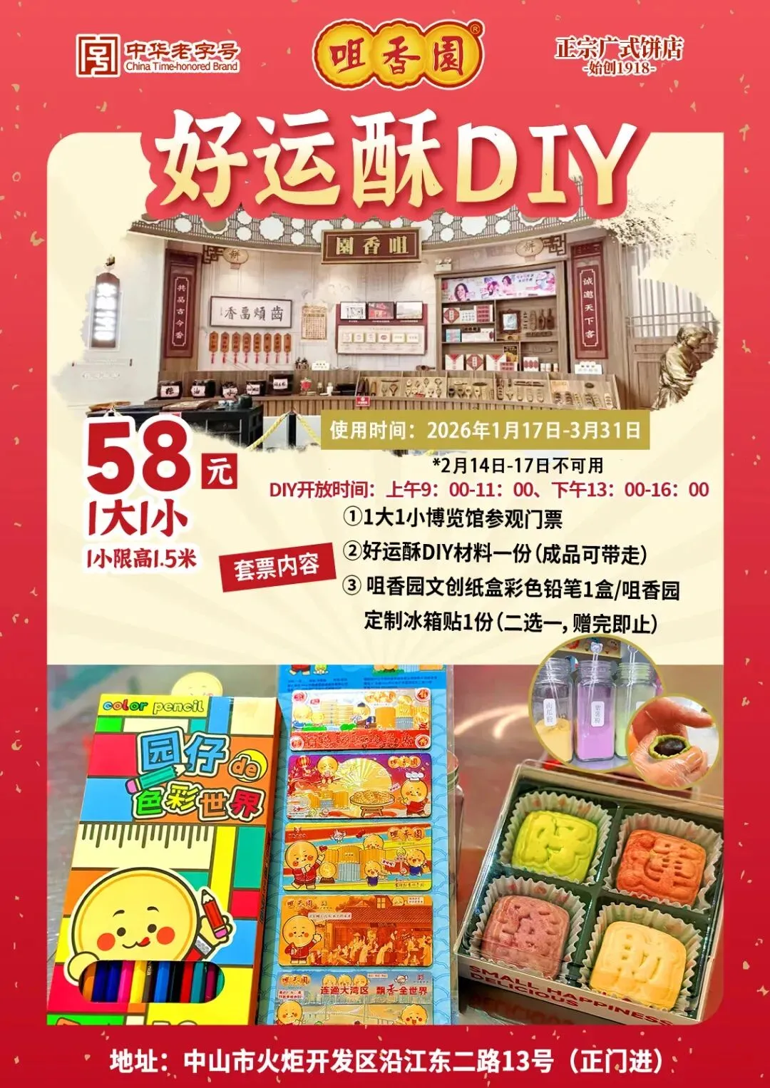 这个马年春节,不妨带孩子玩点有趣的事,来咀香园饼文化博览馆赴一场“马上好运”的好运酥亲子DIY,让大手牵小手,在揉面、调色、包馅、压模的趣味时光里,把马年的吉祥寓意揉进每一块酥饼,把新春的美好祝福藏进每一次欢笑。亲子携手做一份寓意满满的好运酥,一起解锁新春好彩头!