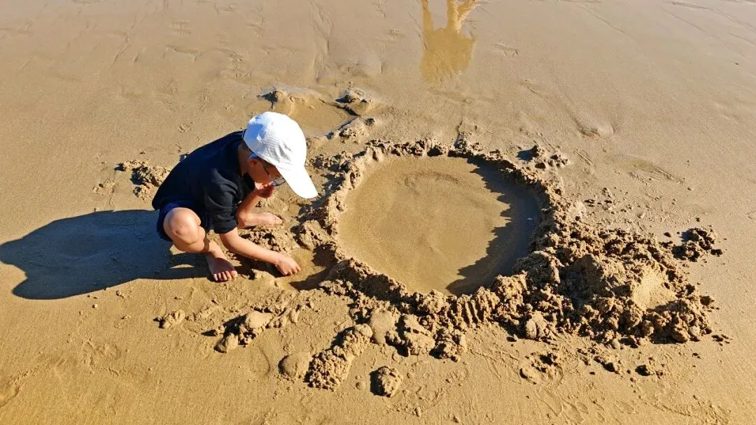 走到一片非常细腻的沙滩边,冬天的大该真的太美了!孩子走不动了,脱了袜子,挽起裤脚就耍起来。