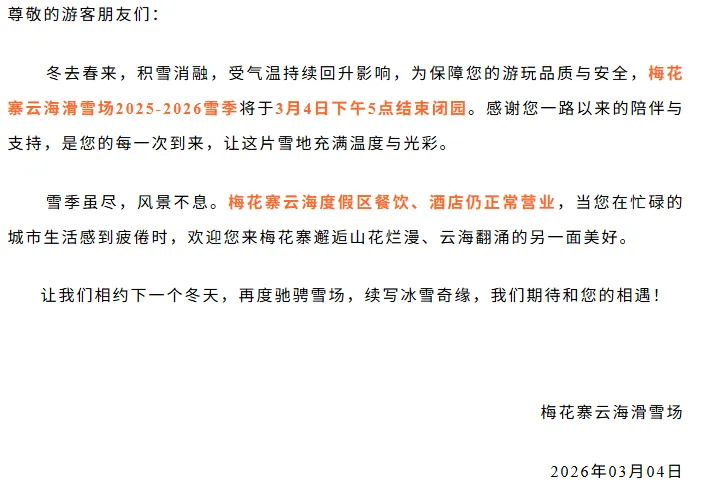 保康梅花寨云海滑雪场发布闭园通知