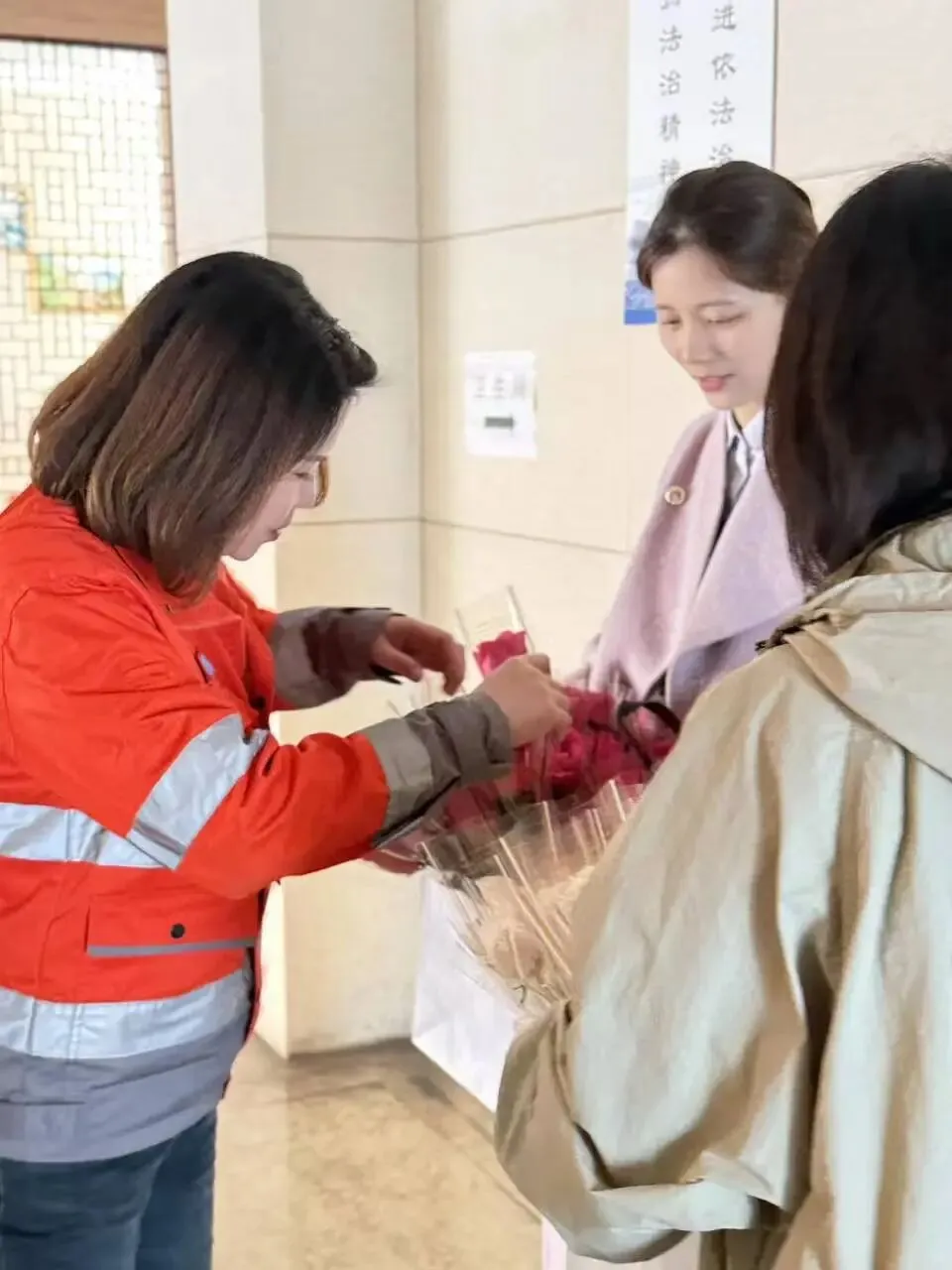慰问现场,花香四溢、暖意融融。交通银行代表将一束束精心准备的玫瑰花送到每一位女职工手中,向大家致以节日的祝福与诚挚的问候,感谢大家在岗位上恪尽职守、勤勉奉献,以女性独有的细腻、坚韧与担当,为企业发展注入温暖而坚定的力量。