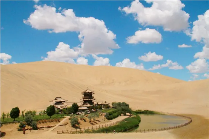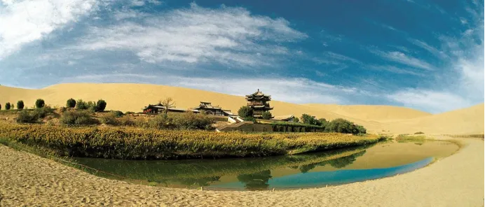 月牙泉处于鸣沙山环抱之中,其形酷似一弯新月而得名。古称沙井,又名药泉,一度讹传渥洼池,清代始称月牙泉。鸣沙山月牙泉以山称奇,以泉叫绝,因沙动成响冠雄,因沙抱月泉显奇,景区内有被誉为天下沙漠第一泉的月牙泉;有世界最大的金沙卧佛山-鸣沙山;有天下罕见的金字塔形沙丘链等大漠奇观。鸣沙山月牙泉风景名胜区规划面积212.86平方公里,风景区面积76.82平方公里,核心区面积12.79平方公里,沙泉共处,妙造天成,古往今来以“沙漠奇观”著称于世。景区由月泉湾、响沙坡、沙丘链、浅丘、戈壁、沙丘试验区等六大景观区组成,以宏大、广阔的风积地貌、奇特的金字塔形沙丘和月牙泉奇观为主体景观资源,以“神、奇、旷、奥、古”为景观资源特征,以响沙之谜和悠久的历史文化为内涵,以资源保护、游览观光、科普教育、文化宣传、休闲活动为主要功能,是代表敦煌自然景观特色并具有世界自然遗产价值的国家级风景名胜区。