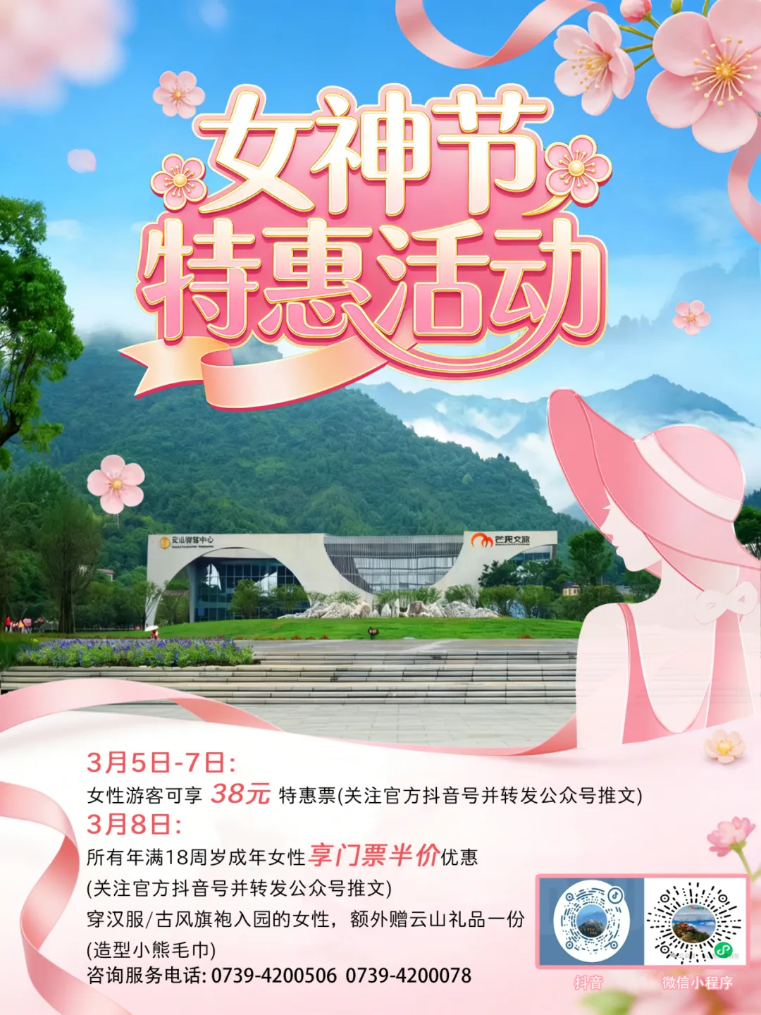1.所有优惠活动均需关注武冈云山景区官方抖音号并转发云山旅游度假区公众号《云山女神节 | 赴一场春日之约,做自己的女王!》推文至朋友圈,方可生效。