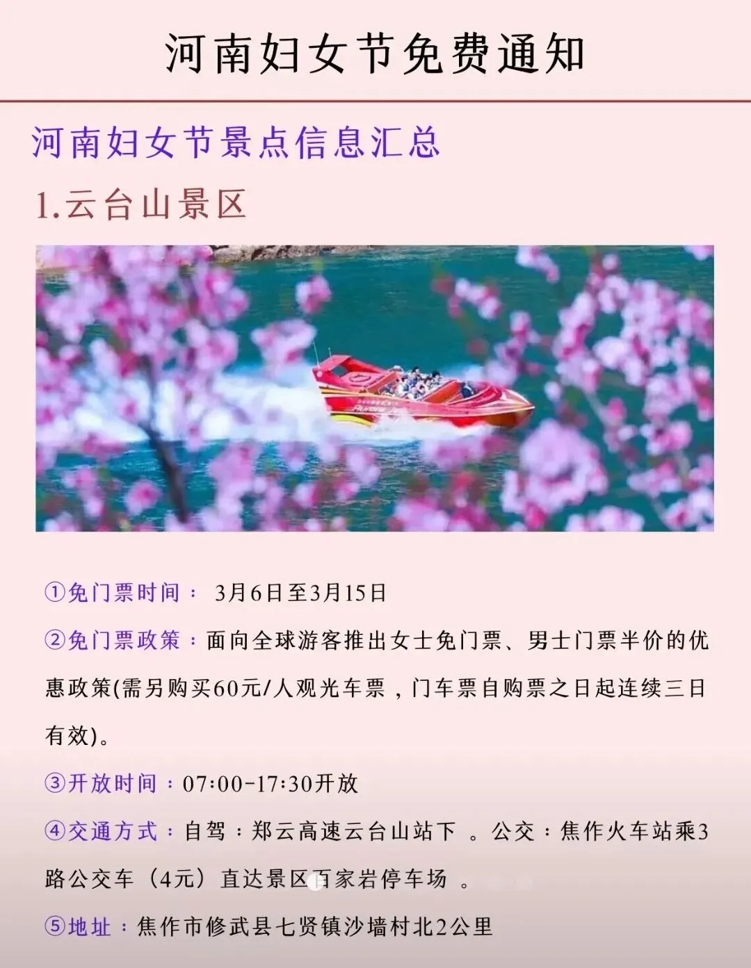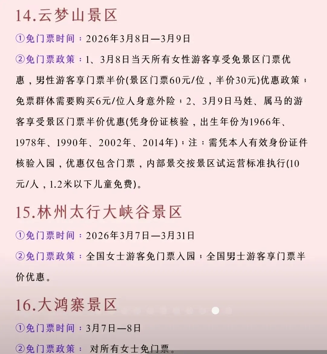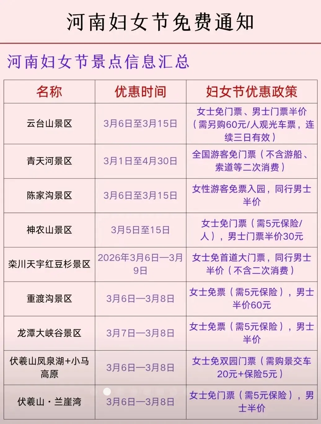 河南妇女节景点优惠信息到啦~朋友,你好!我是明媚,三八妇女节就要到了,整理分享河南妇女节景点优惠通知,供参考,欢迎收藏转发!