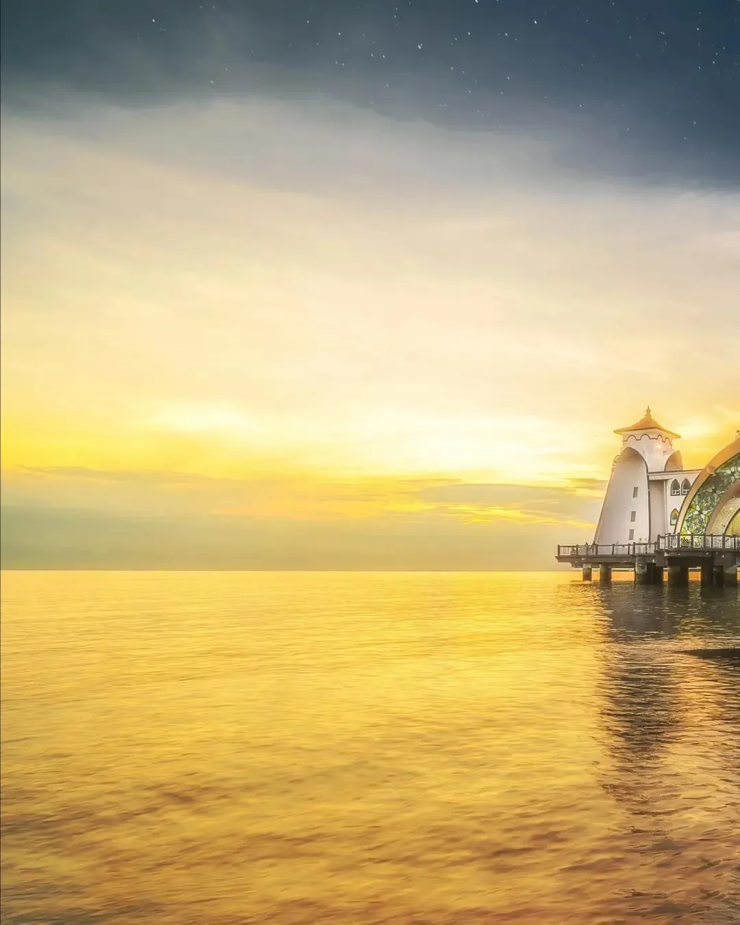 海峡清真寺°:建在马六甲海峡边,涨潮时像漂浮在海上,日落时分的剪影美得让人失语。