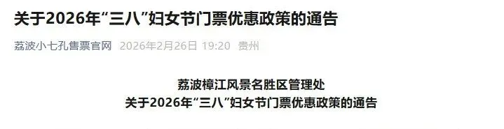 注:以上两个福利仅限于2026年3月7日-3月8日两天所有女性同胞享受。活动期间,全国女性游客凭本人有效证件至各景区窗口兑换0元门票;大瀑布景区38元优惠套餐,需凭本人有效证件在大瀑布景区游客中心购买。