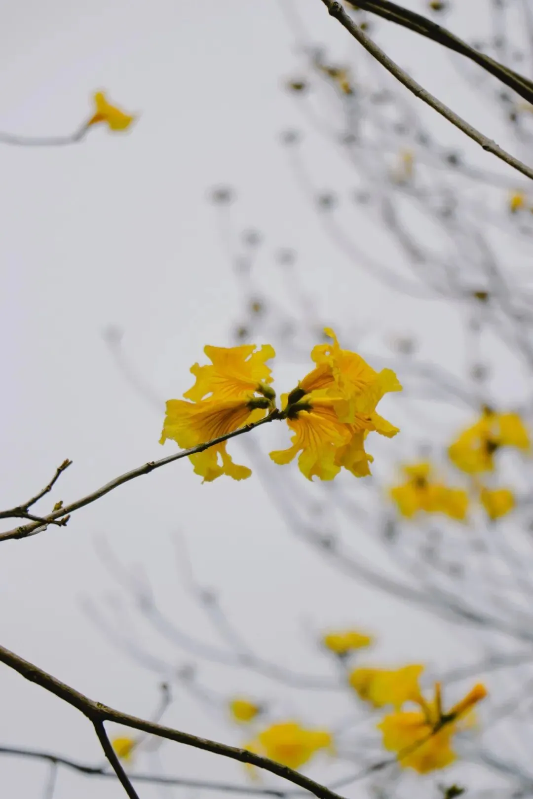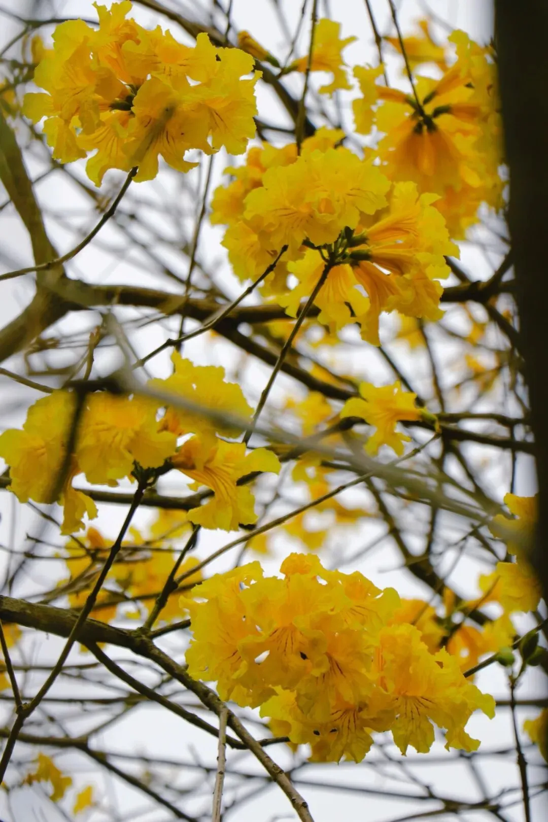这里的黄花风铃木依山势而生,花朵在蓝天映衬下格外耀眼,像一串串悬挂山间的金色风铃,随风轻摇。