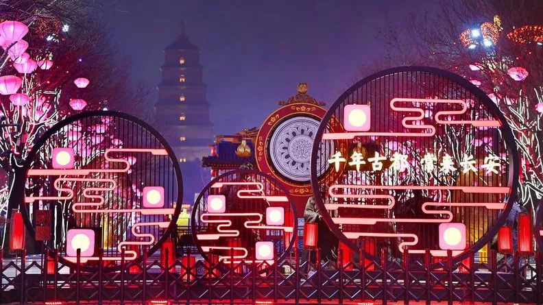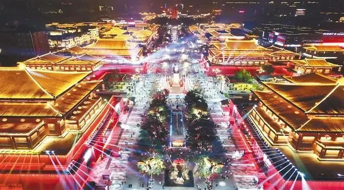 大唐不夜城,位于陕西省西安市的雁塔区大雁塔脚下,北起大雁塔南广场,南至唐城墙遗址,东起慈恩东路,西至慈恩西路,街区南北长2100米,东西宽500米,总建筑面积65万平方米。大唐不夜城以盛唐文化为背景,以唐风元素为主线 ,建设有四大广场、四大文化场馆、五大文化雕塑,是西安向人们展示盛唐文化和体验的地方。2020年7月,大唐不夜城步行街入选首批全国示范步行街名单。
