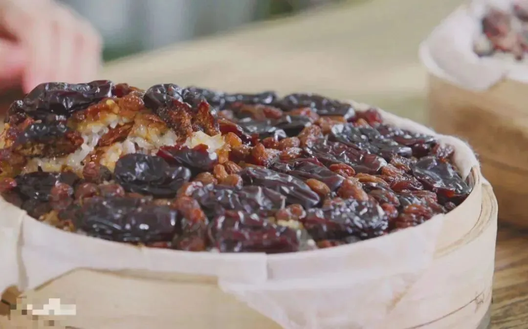 甑糕质地柔软细腻,这种甜品小吃是用糯米、芸豆和红枣蒸成的。蒸熟后的甑糕香味四溢,呈鲜润的绛红色,上面撒了一层碧绿的葡萄干,让人忍不住想要咬一口。