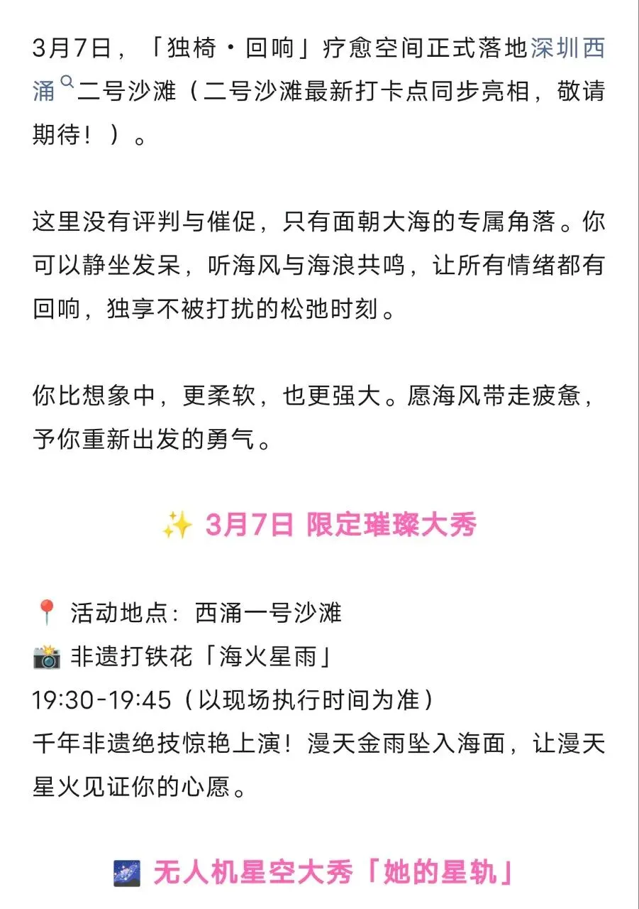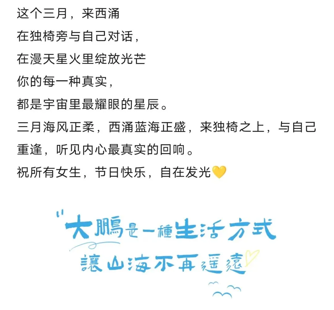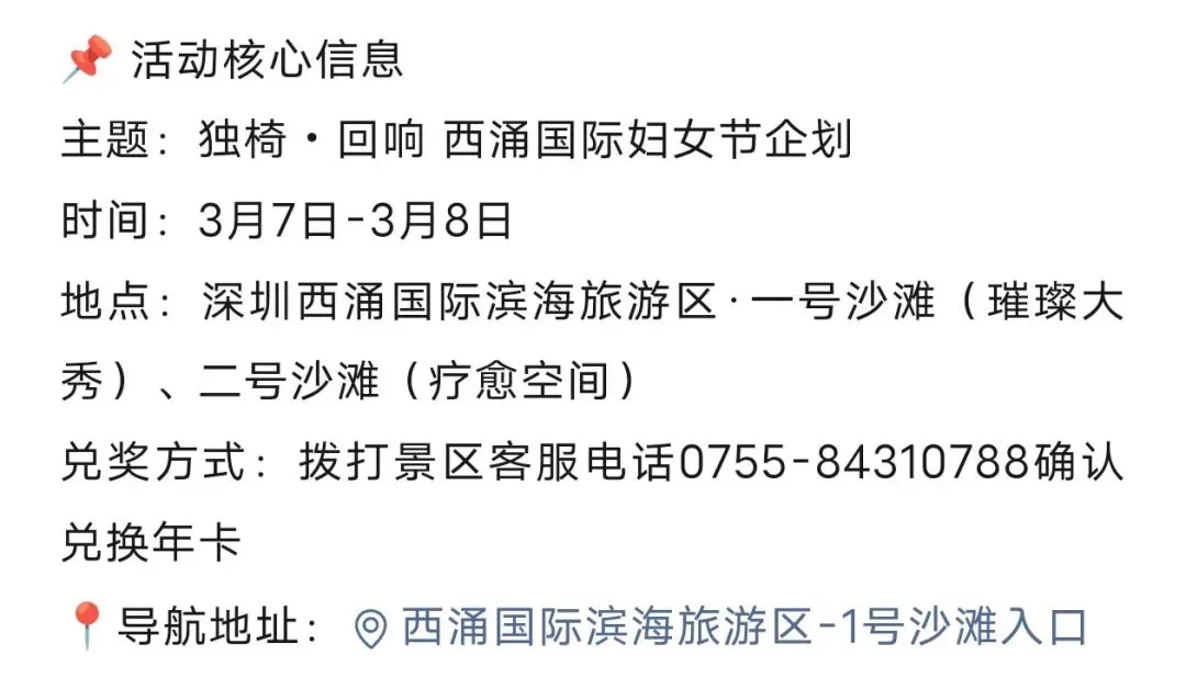 您现在的位置是:首页 > 国内旅游目的推荐 > 正文 国内旅游目的推荐 大鹏新区这个景点38妇女节,女性免门票! admin2026年03月06日 20:22:08国内旅游目的推荐1 大鹏新区这个景点38妇女节,女性免门票!信息来源:大鹏文旅通、西涌国际滨海旅游区 转载请说明来源于"旅荐网",部分内容转载自网络,如有侵权请联系qlwl@foxmail.com删除 本文地址:https://www.15386.cn/post/135451.html 上一篇 全国小众景点,人少景美不排队!这8个宝藏地藏着2026年最治愈的风景 下一篇 来银川必去的5大景点 相关文章 川龙峡漂流景点门票 来银川必去的5大景点 全国小众景点,人少景美不排队!这8个宝藏地藏着2026年最治愈的风景 湖北恩施旅游必去的8个景点,看看你都去过几个?绝对值得收藏! 青杠坡的野景点四野屯景区 国家植物园,卧佛寺牌楼 #北京历史景点 哈哈我也可以免费进出各大景点啦! 观山湖公园景点还是多[破涕为笑] 第一站,红色景点[强][强][强] 告别百元导游租赁费,一部手机玩转景点 发表评论 取消回复 评论列表 这篇文章还没有收到评论,赶紧来抢沙发吧~
