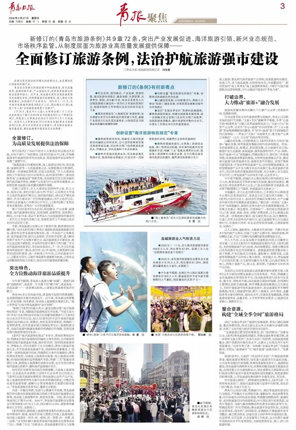 2月27日,青岛日报刊发题为《全面修订旅游条例,法治护航旅游强市建设》的新闻报道。现将全文分享如下: