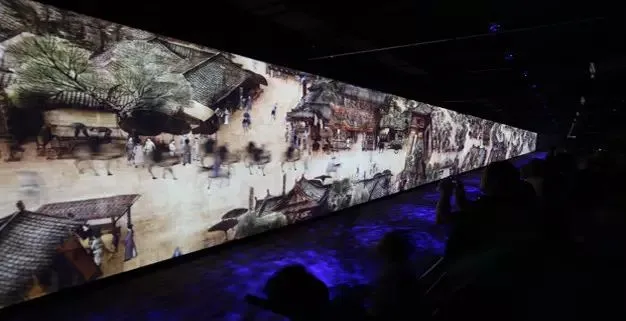 通过科技手段把《清明上河图》活化起来,在近200平方的幕布上动态画卷徐徐展开,近千名形态各异的人物,通过动态环境的组合,将繁忙的漕运、喧闹的街市、祥和的宅院以及昼夜的交替表现得惟妙惟肖,展现了盛世宋朝的都市风情。