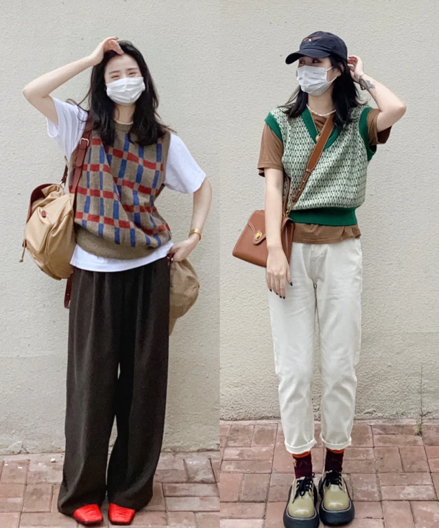 针织马甲叠穿就比较简单了,只要配好颜色就OK了,如果是彩色的马甲叠穿白T,就会很清新了,也可以尝试同色系的叠穿,看起来会很洋气。