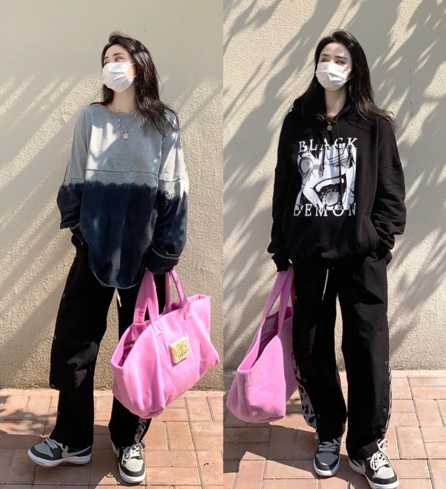 黑色卫衣,简约显瘦,搭配黑色的休闲裤,整套选择黑色,看起来酷感十足,特别洋气,适合微胖的女生。