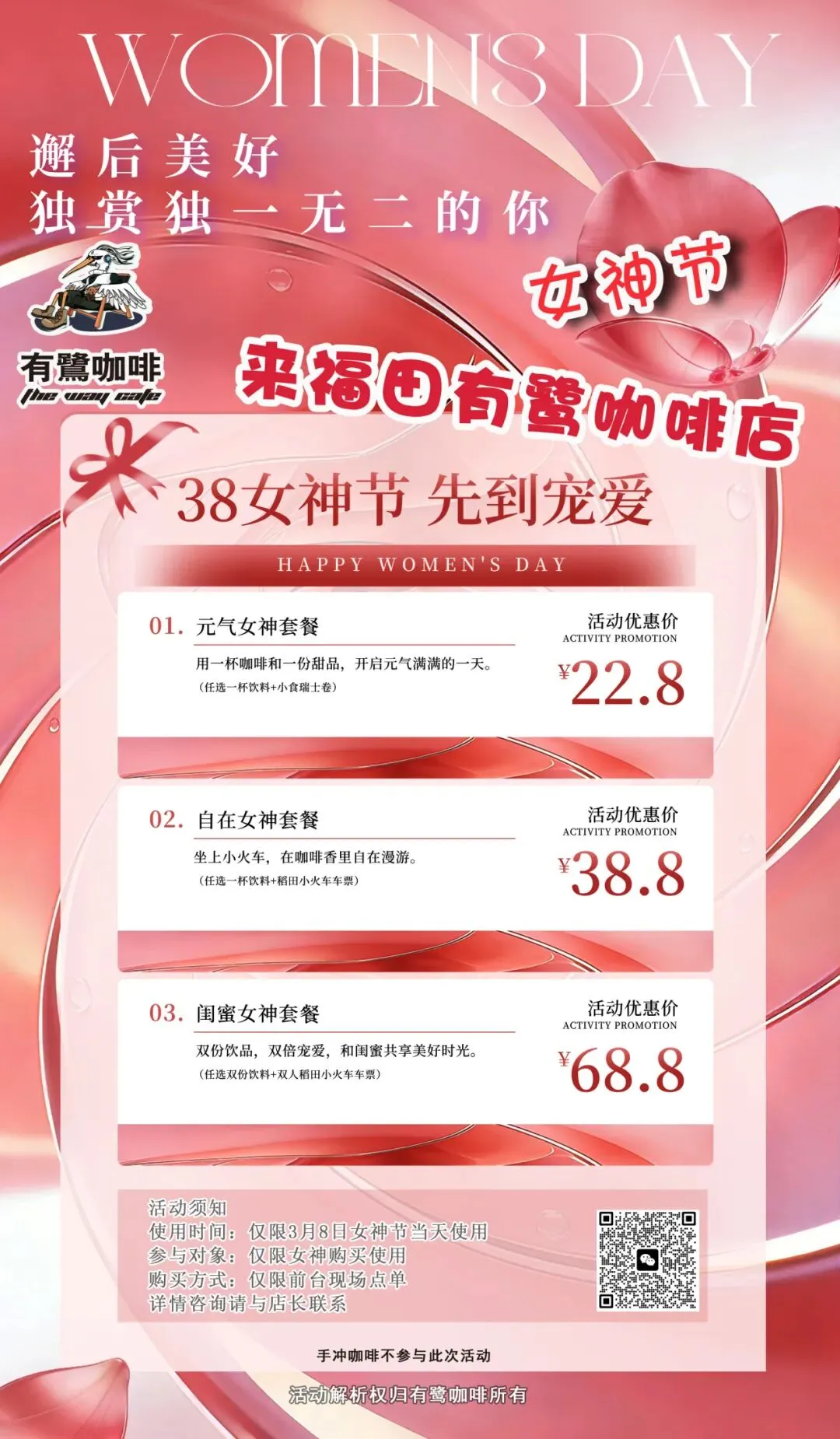 ❤ 优惠措施:3月8日当天在有鹭咖啡前台现场点单享三个档位套餐优惠。