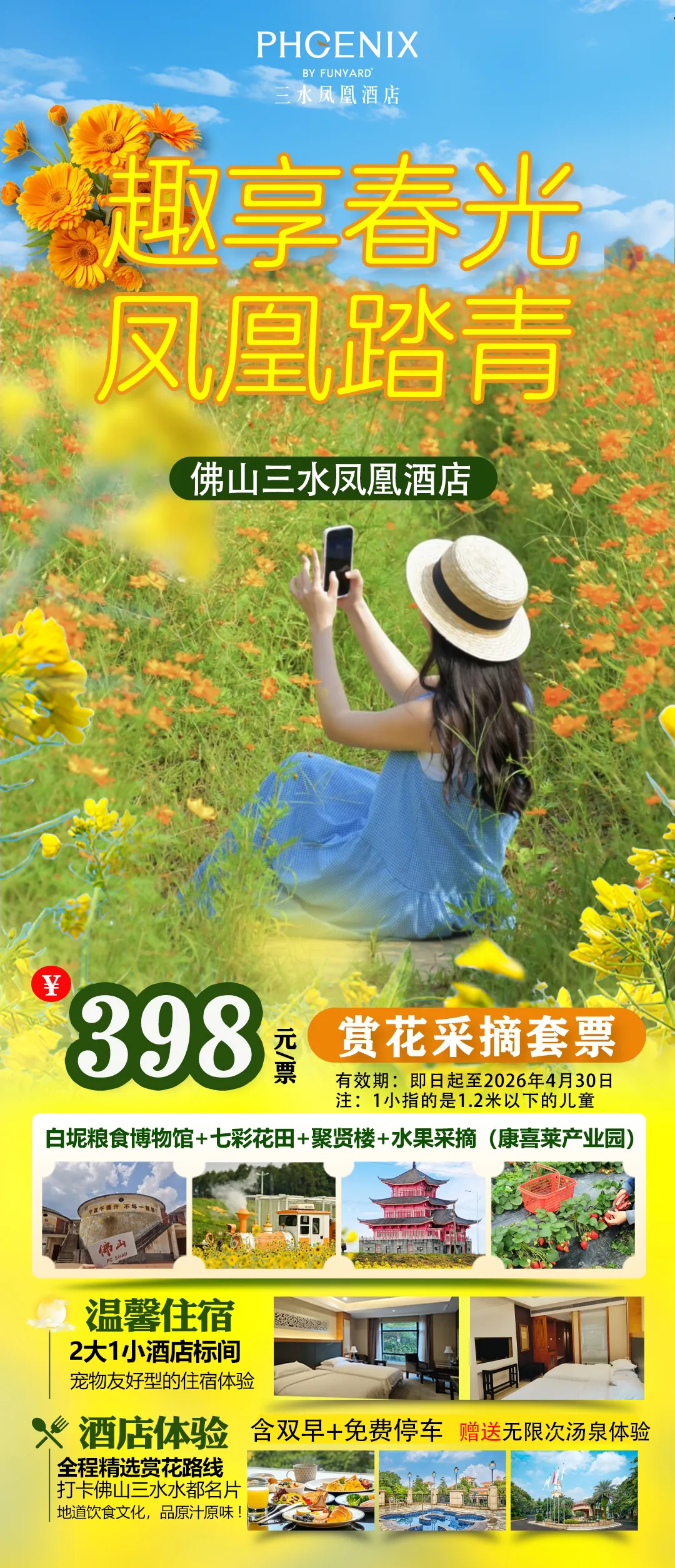 ❤ 优惠措施:即日起至4月30日,推出398元赏花采摘套票,包含2大1小酒店标间(含双早+免费停车,赠送无限次汤泉体验),前20名可升级房型。