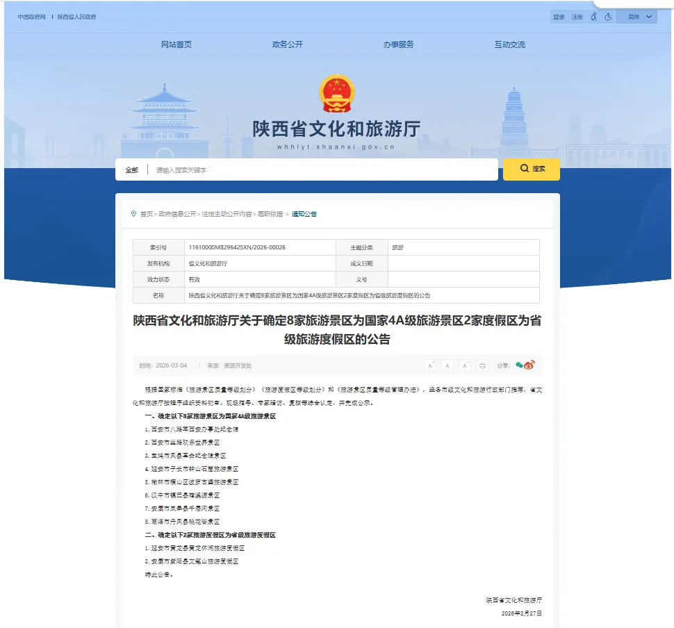 发布《关于确定8家旅游景区为国家4A级旅游景区2家度假区为省级旅游度假区的公告》